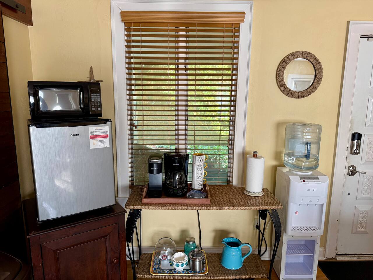 There is no kitchen or sink other than the bathroom sink. There is a Culligan-like water service with hot and cold water for tea, coffee, drinking.