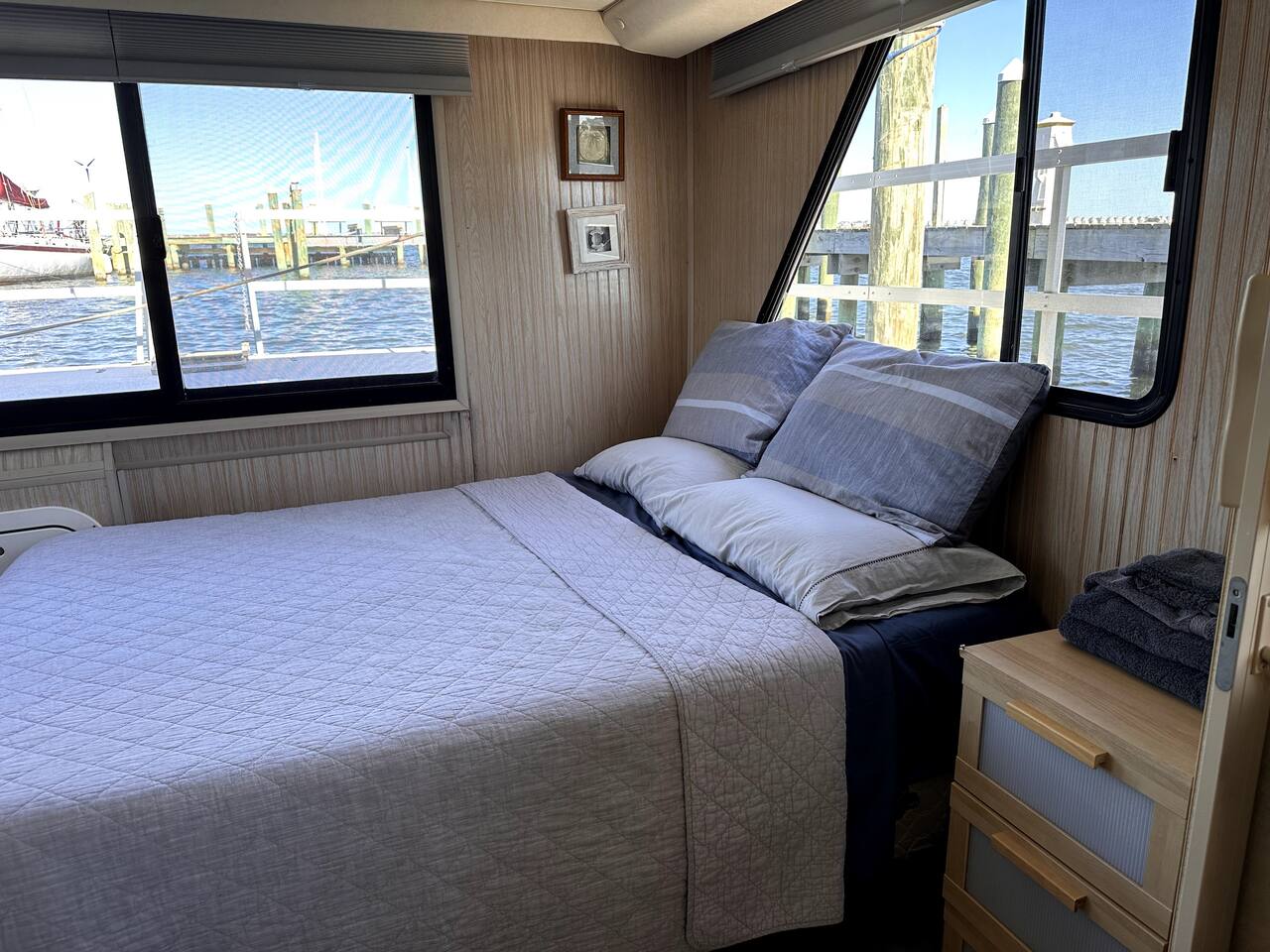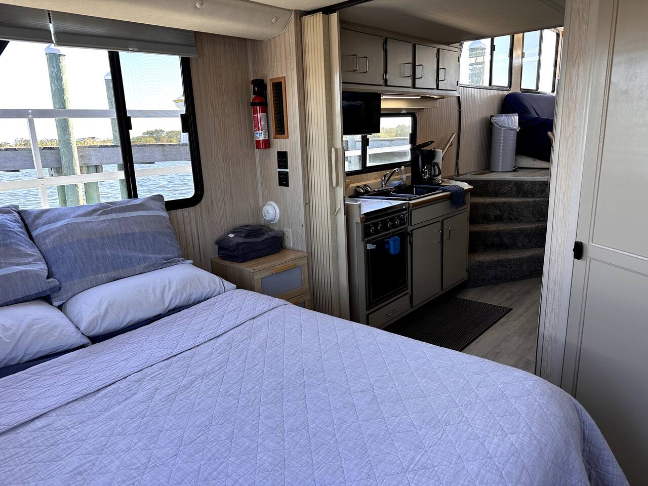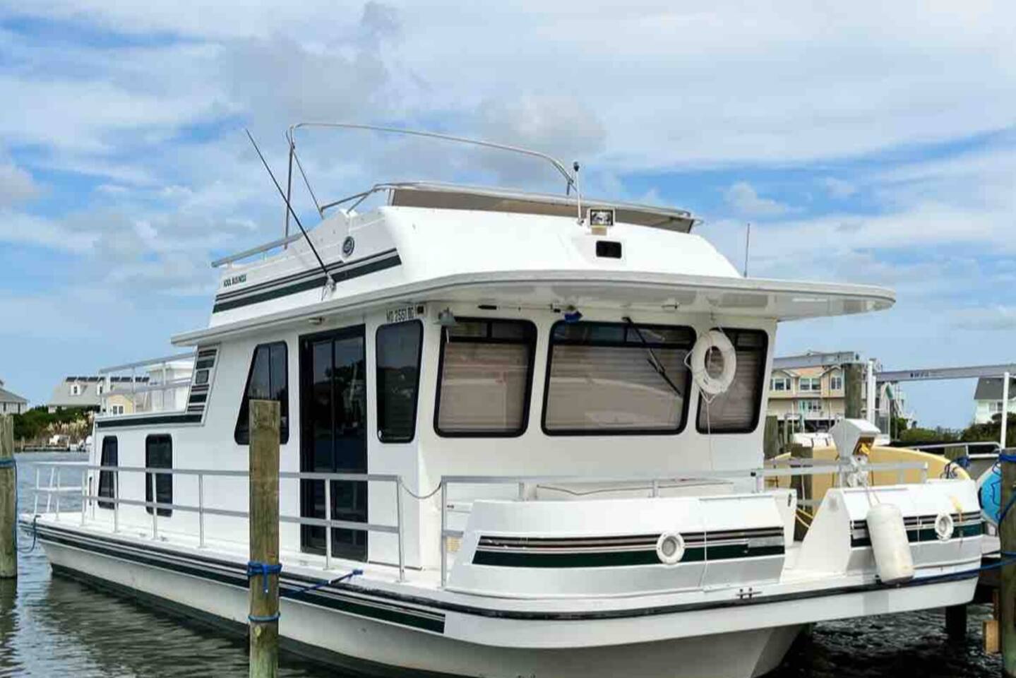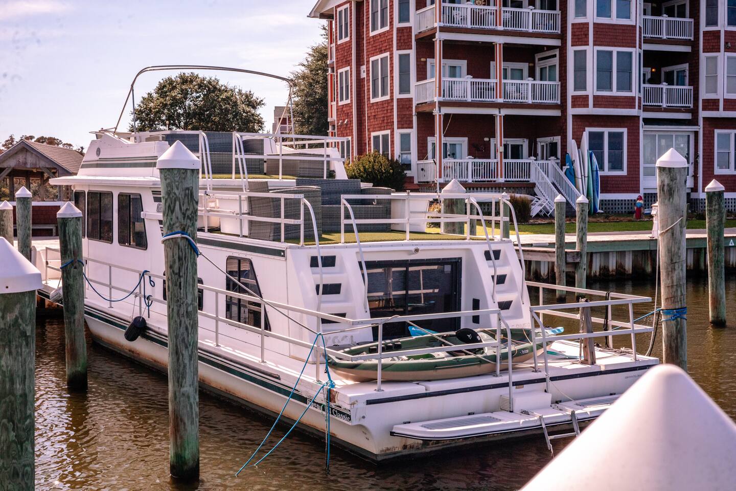 This space adopted a Hawksbill Bale - Travel with Purpose when you stay with us and assist in global efforts to help save this beautiful endangered species! Eco-Inspired Waterfront Stay • Kayaks Included • Unique Floating Experience 🚤 What You’ll Love: Stay aboard a peaceful floating home in a quiet marina Your own private WiFi—stay connected while you float 2 fishing & pleasure kayaks included for exploring the surrounding waters A truly unique, eco-conscious escape—perfect for couples, creatives, and adventurers Whether you're watching the sunrise from the deck, kayaking through calm waters, or simply enjoying the rhythm of life on the water, Floating in Paradise offers a stay that’s both serene and sustainable. Float with purpose. Book your unforgettable waterfront getaway today! The Azul Project, a 2004 44' Gibson Houseboat! Soak up the sunshine or stay tucked inside cuddled up with your favorite book and enjoy the North Carolina fresh salty air! The Aft Master Stateroom has a Vanity, Dresser Storage, adjoining bath with electric head (toilet) and sink! (NOTE: Shower onboard is not for use. Just steps away from boat are two showers located in Marina building next to laundry room. There are also several other showers with regular indoor plumbing located in the Clubhouse that you have access to during your stay. These spaces are maintained by the Marina and not your host.) Also, on board is a well equipped kitchen with refrigerator and freezer (bring your own ice), microwave, pantry, double sink, 3-burner range & dining area! You will notice oven in picture but it is NOT an offered amenity. Located in the Salon is a sofa with Roku Smart TV, DVD player with several DVDs and AM/FM radio! Note - cable/satellite not provided. Carpet on stairs and LVT flooring throughout the rest of the boat! Lots of outdoor decking with outdoor couches to enjoy the Carolina sunshine and Shallowbag Bay Views! NOTE - No outdoor shade coverage due to high winds that can creep up on us in the OBX and could cause a safety issue.