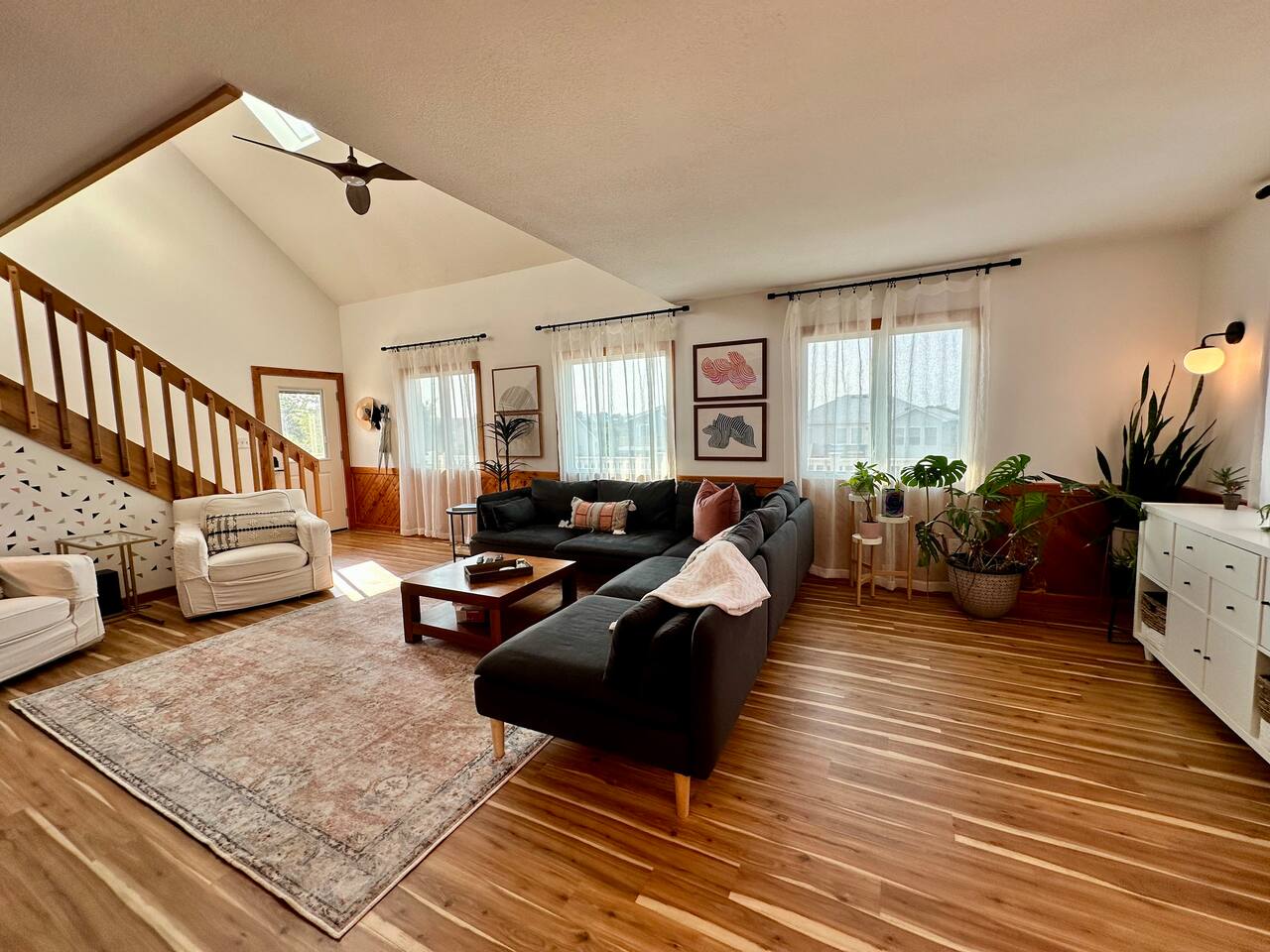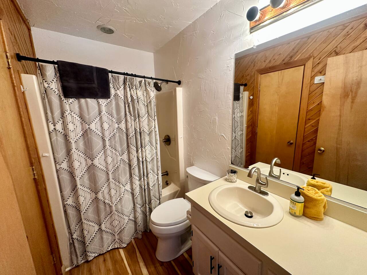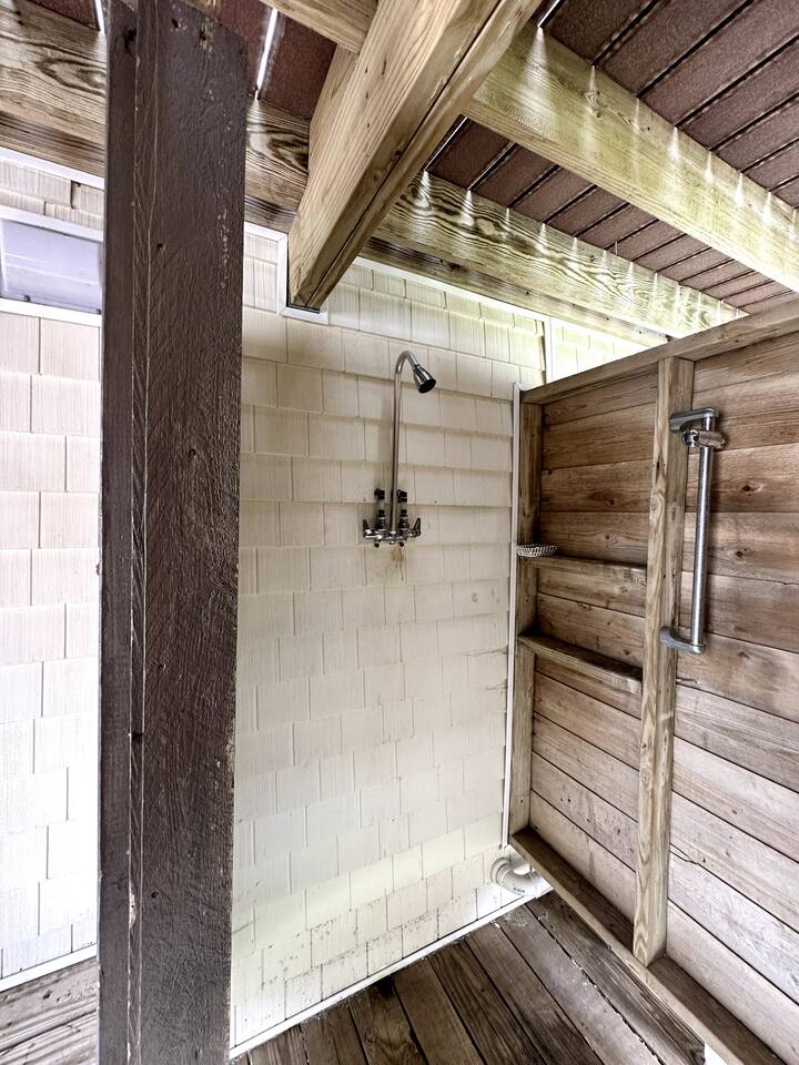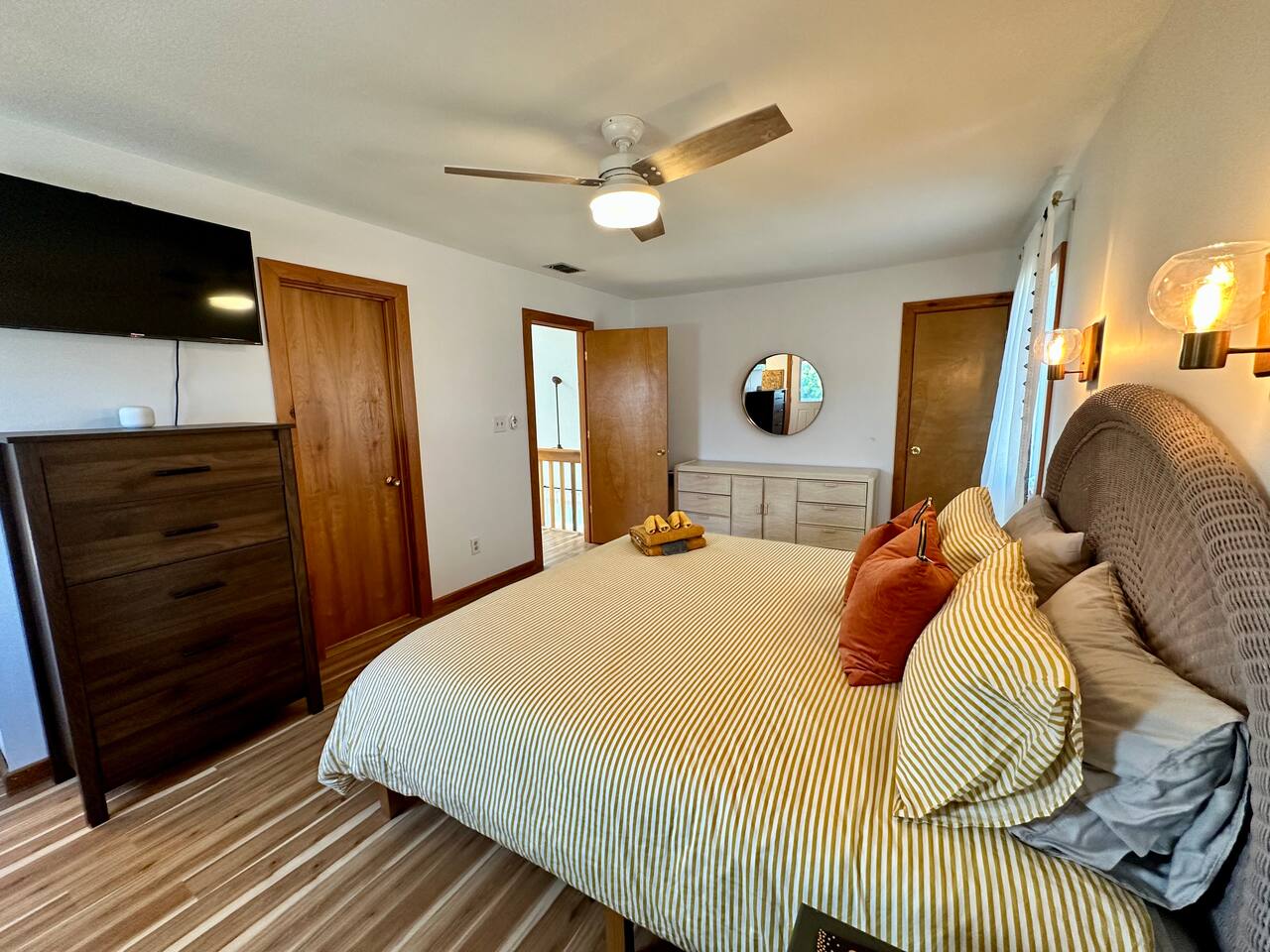 This home adopted a Sumatran Rhino- Travel with Purpose when you stay with us and assist in global efforts to help save this beautiful species! Very spacious home with lots of decking on both the front and back of house! Go up one flight of stairs and enter into the living room with very high vaulted ceilings! Open living concept with living room, dining room, and kitchen all on the same level. Also one queen bedroom and full bathroom with shower located on the same level. Go up stairs to top level to find the super spacious master bedroom with King bed, TV, and private deck! Full bathroom with tub/shower located on top level! Ceiling fans throughout! Screened in porch with mini fridge on back porch in addition to additional deck to retreat to! Take stairs down to fenced in backyard to pool, and outdoor shower under home!