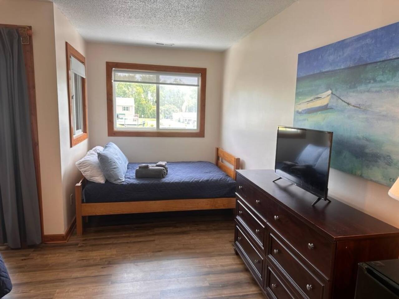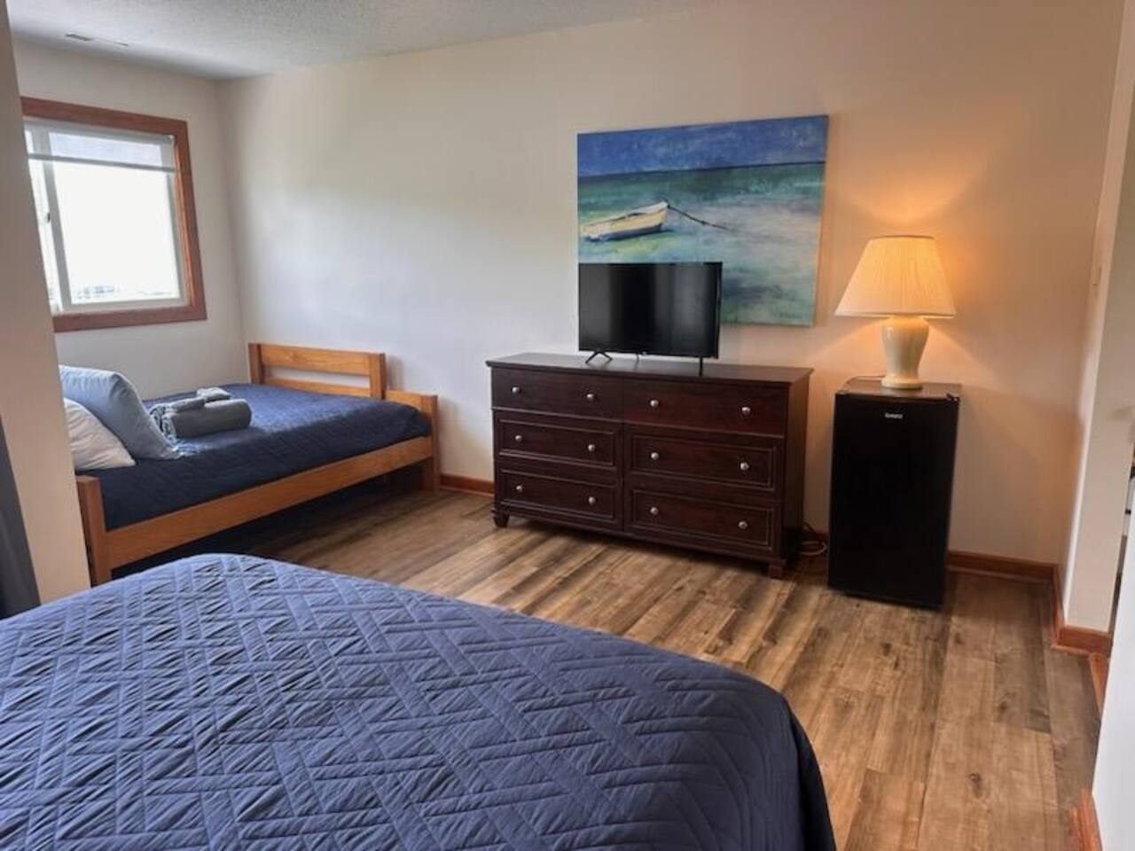 🛏️ What You’ll Find: Two cozy beds (one queen & one double) for post-exploration crashing A no-fuss kitchenette (microwave, mini fridge, & essentials) for easy meals A private balcony perfect for morning coffee, evening drinks, or plotting your next move Water views of Coinjock Marina & Restaurant—only 5 mins away Access to a boat ramp and slips (extra charge) for seafarers bringing their own vessel 30 minutes to the OBX beaches and Kitty Hawk Pier This isn’t a luxury resort—it’s a rest stop for the curious, the spontaneous, and the ones who always want to see what’s around the next bend in the road (or river). Whether you're chasing fish, waves, or memories, Knot Three offers a simple, scenic stay with character, charm, and killer views. Perched on the Intracoastal Waterway, a hotel style room with two beds, ceiling fan, Smart TV (no cable), full bathroom, coffee maker, dorm refrigerator, microwave and coffee pot. NOTE: Building is older as pictured - dock infront of the building is not accessible at this time. Walk down approximately 100 feet where dock is accessible to you to fish from and enjoy the waterway up close and personal! Due to the remote location on the Intracoastal Waterway you will unplug here as WIFI is not reliable. Come enjoy all that comes with living on the Intracoastal Waterway, the boats passing by, nature and a home cooked meals at the Coinjock Marina Restaurant!