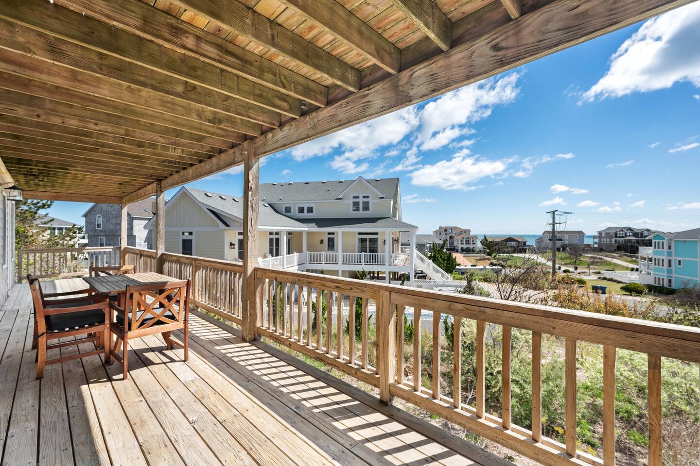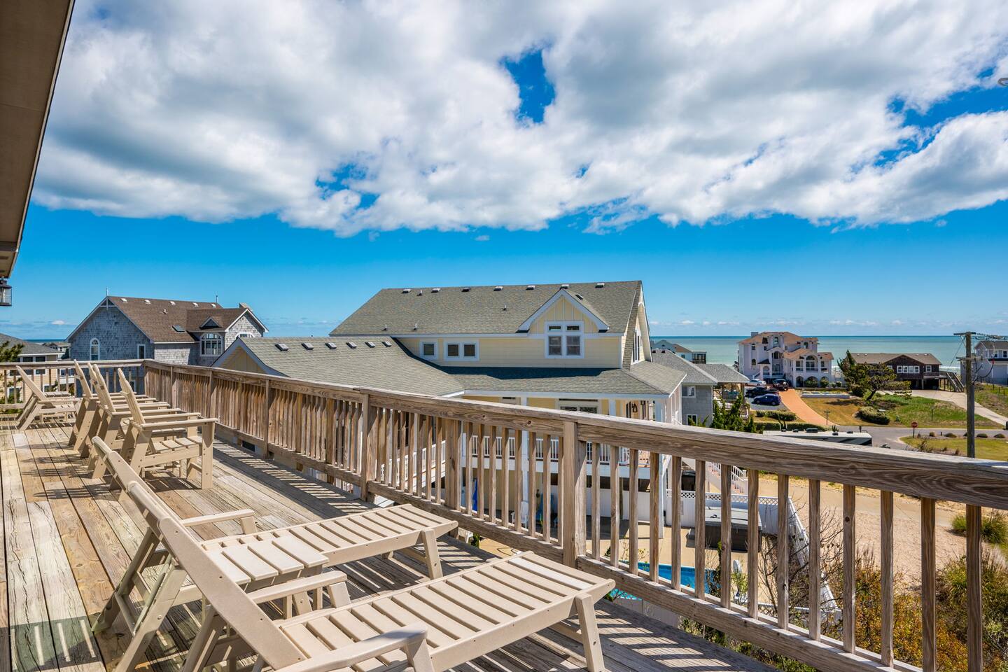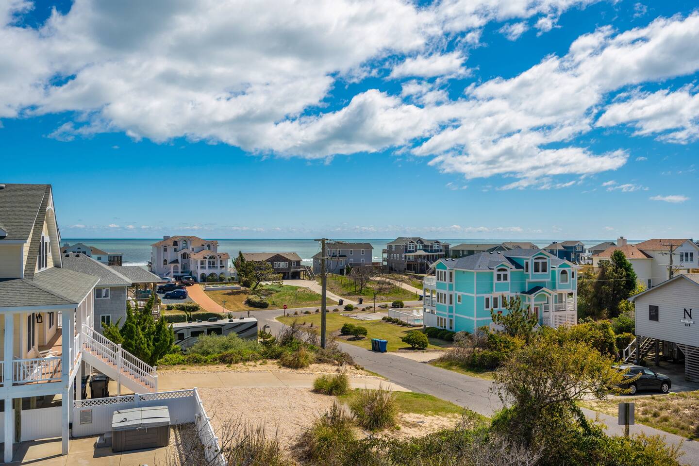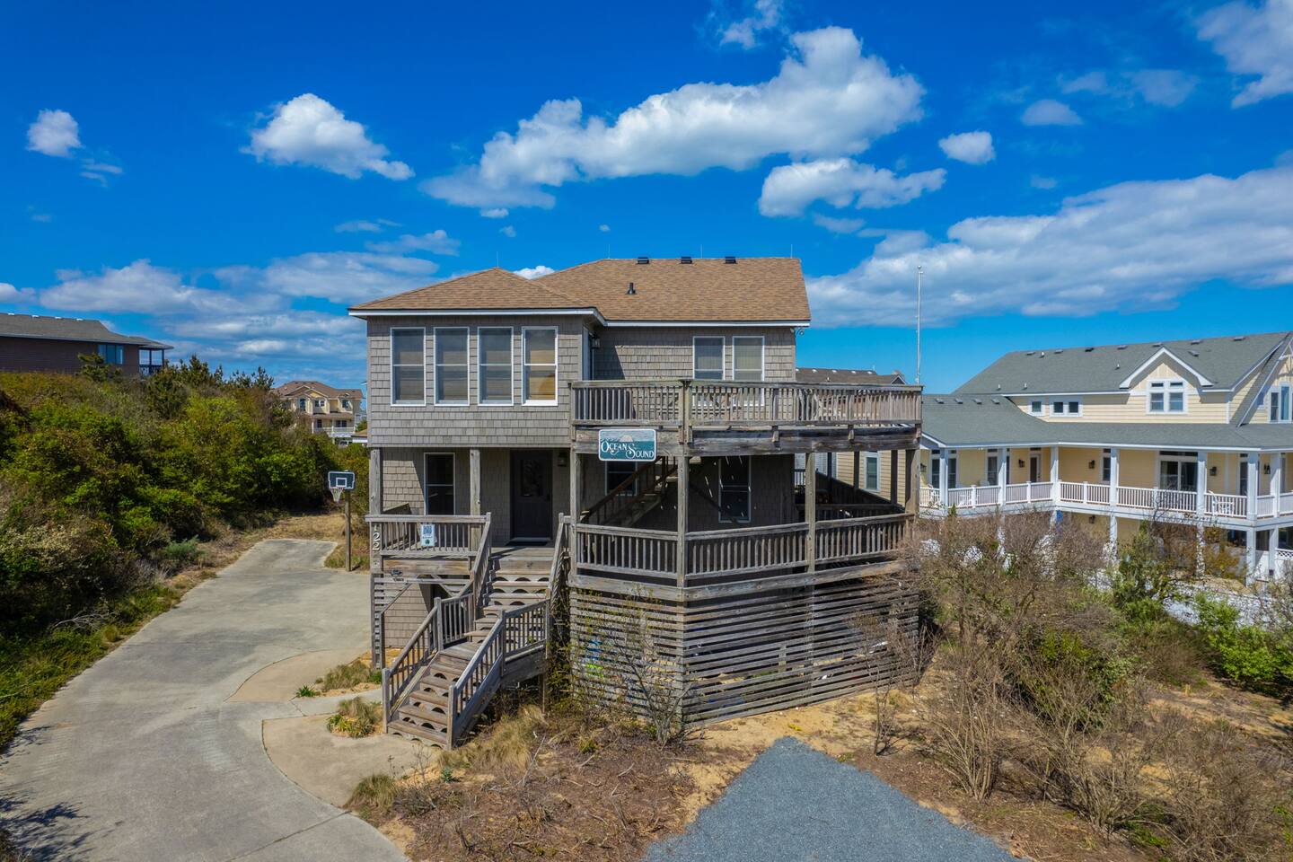 🌊 Soak up panoramic views of the Atlantic from sunrise to starry skies 🛍️ Just minutes to Downtown Duck’s shops, restaurants, boardwalk, and more 📍 Centrally located – easy to explore north to Corolla & Carova or south to Kitty Hawk & Kill Devil Hills 🌅 Enjoy access to both the Sound and the Ocean in the welcoming Carolina Dunes community 🏡 Spacious and comfortable – ideal for families or groups of friends looking to relax and reconnect Walk up one flight of stairs to the second story level where four of the five bedrooms are located. Go up one more level to the open dining, living, well outfitted kitchen, and master suite at top level of the home. Two levels of decks facing the ocean for your maximum enjoyment of outdoors and the salty ocean breeze. The lower level deck does have coverage to provide a nice shady area to retreat to. The top deck is a great spot to soak up the rays! Four bedrooms have full ensuite bathrooms. The twin bedroom has access to a full hall bath. At top level off the dining room and close proximity to the porches is a half bath. At ground level outside under the home are additional shaded areas to retreat with swing, hammock, charcoal grill, etc.