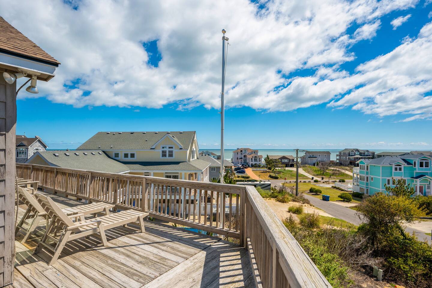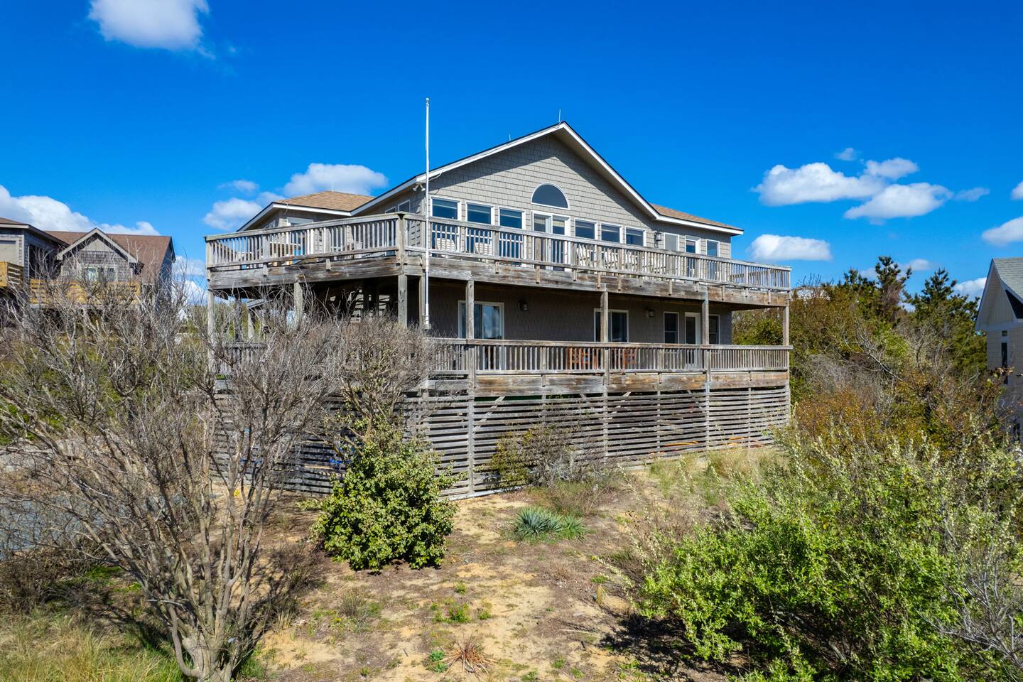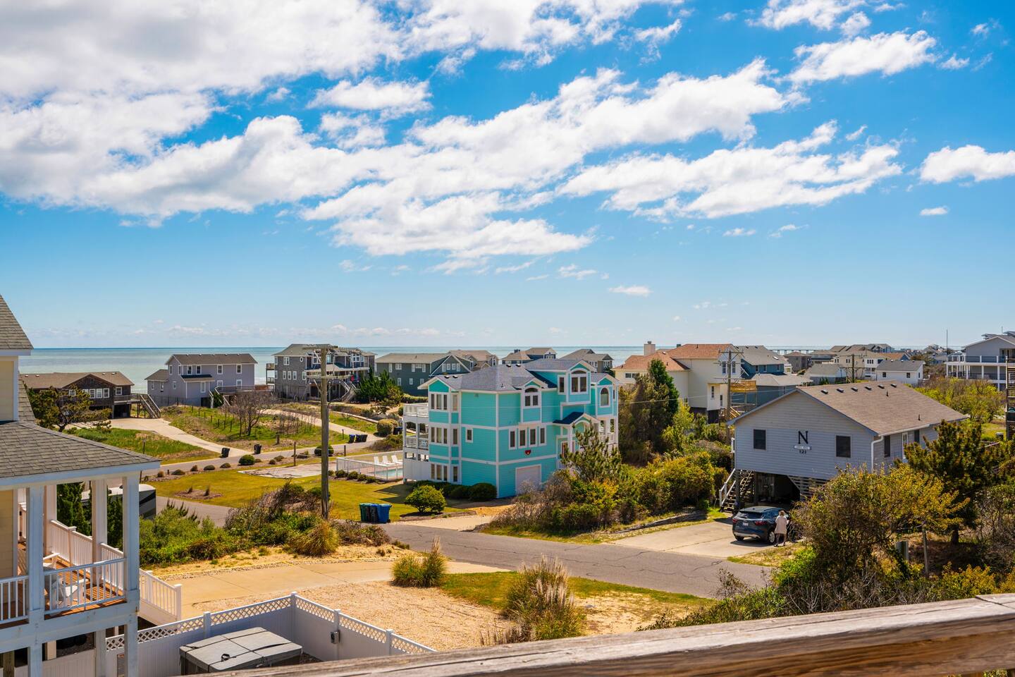 🌊 Soak up panoramic views of the Atlantic from sunrise to starry skies 🛍️ Just minutes to Downtown Duck’s shops, restaurants, boardwalk, and more 📍 Centrally located – easy to explore north to Corolla & Carova or south to Kitty Hawk & Kill Devil Hills 🌅 Enjoy access to both the Sound and the Ocean in the welcoming Carolina Dunes community 🏡 Spacious and comfortable – ideal for families or groups of friends looking to relax and reconnect Walk up one flight of stairs to the second story level where four of the five bedrooms are located. Go up one more level to the open dining, living, well outfitted kitchen, and master suite at top level of the home. Two levels of decks facing the ocean for your maximum enjoyment of outdoors and the salty ocean breeze. The lower level deck does have coverage to provide a nice shady area to retreat to. The top deck is a great spot to soak up the rays! Four bedrooms have full ensuite bathrooms. The twin bedroom has access to a full hall bath. At top level off the dining room and close proximity to the porches is a half bath. At ground level outside under the home are additional shaded areas to retreat with swing, hammock, charcoal grill, etc.