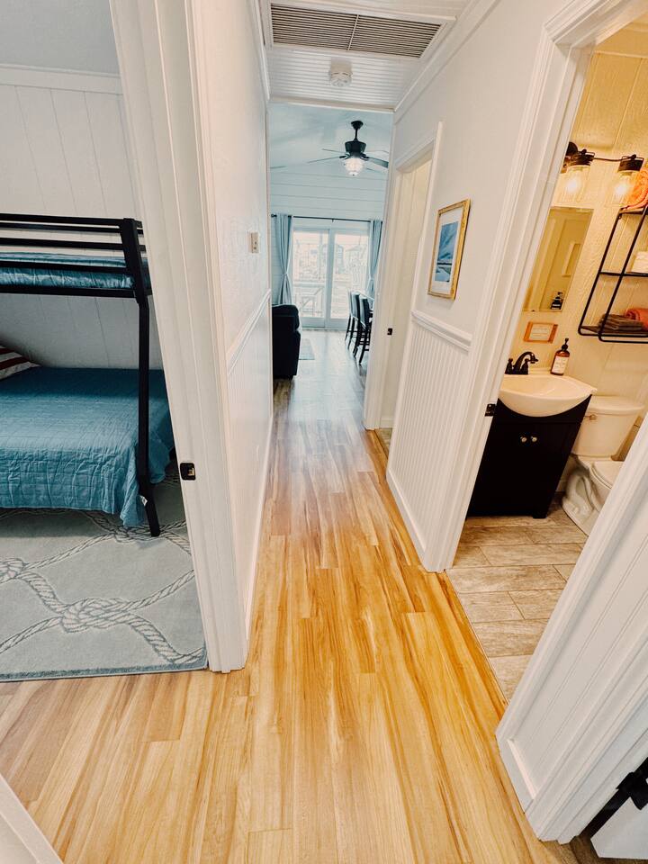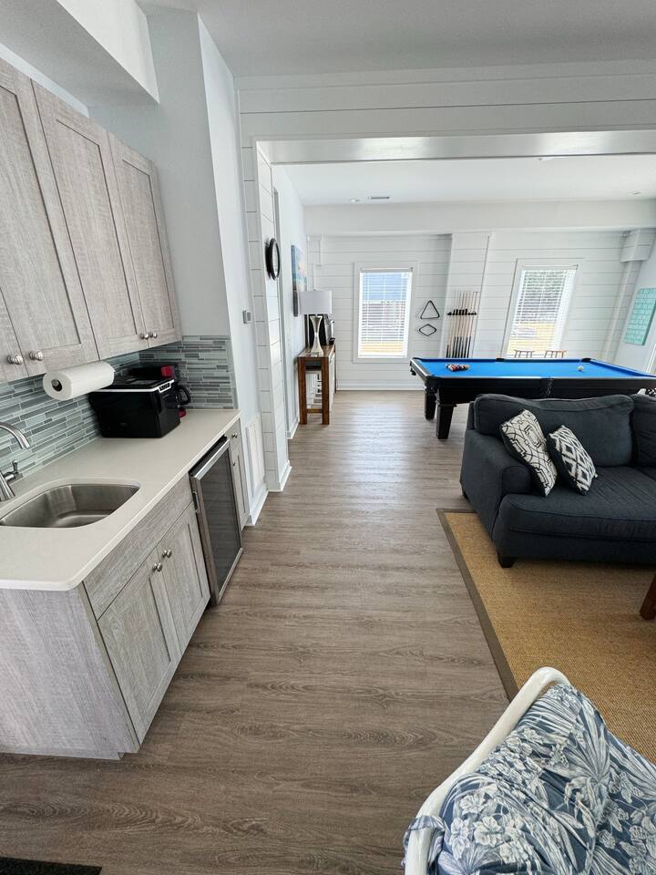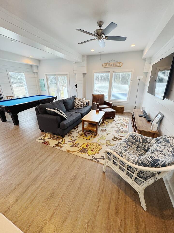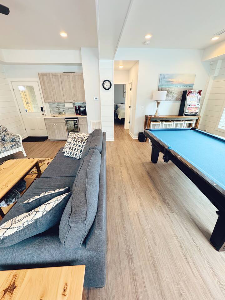 Take a dip in the heated pool or hot tub, bring on some friendly competition in the game room, cook & gather in the fully equipped kitchen, & unwind on the ocean-view porch as salty breezes & sunset colors set the mood! Breakfast, lunch & dinner can be prepared in the well-equipped, full kitchen complete or head out to the pool deck & fire up the gas grill to add a little spice to your home-cooked menu. Kick back and stream your favorite shows and movies in the top-floor living area, or shoot some pool in the lower-level rec. room. And right outside, you'll find a sundeck with plenty of seating, a pool, a hot tub, and even an outdoor Bluetooth speaker system to play your favorite music. This cottage also includes four comfortable bedrooms, three of which have King beds, the fourth being a kid-friendly trundle-bed room. The upstairs unit is separate from the downstairs unit (equipped with a wet bar, mini fridge, pool table, master bedroom with king bed, full bathroom, & access to the pool) & is not accessible by interior stairs. It is accessible by a private entrance on the ground floor & is great for some private sleeping arrangements within the group.