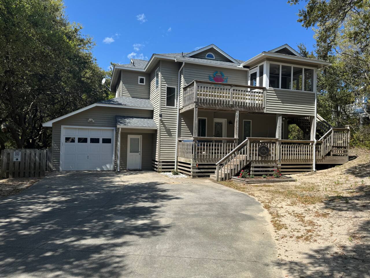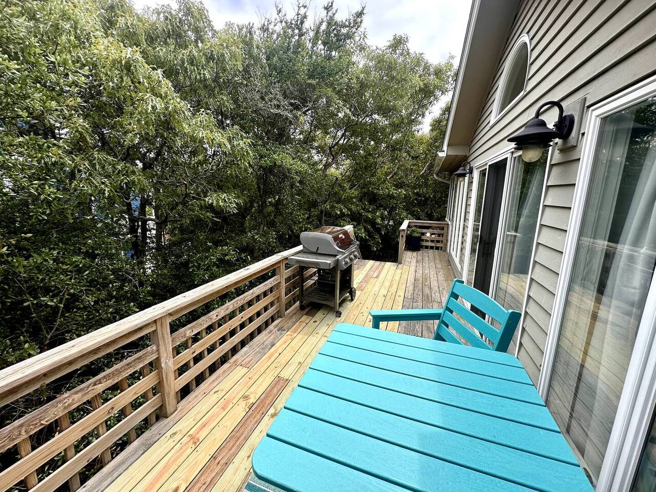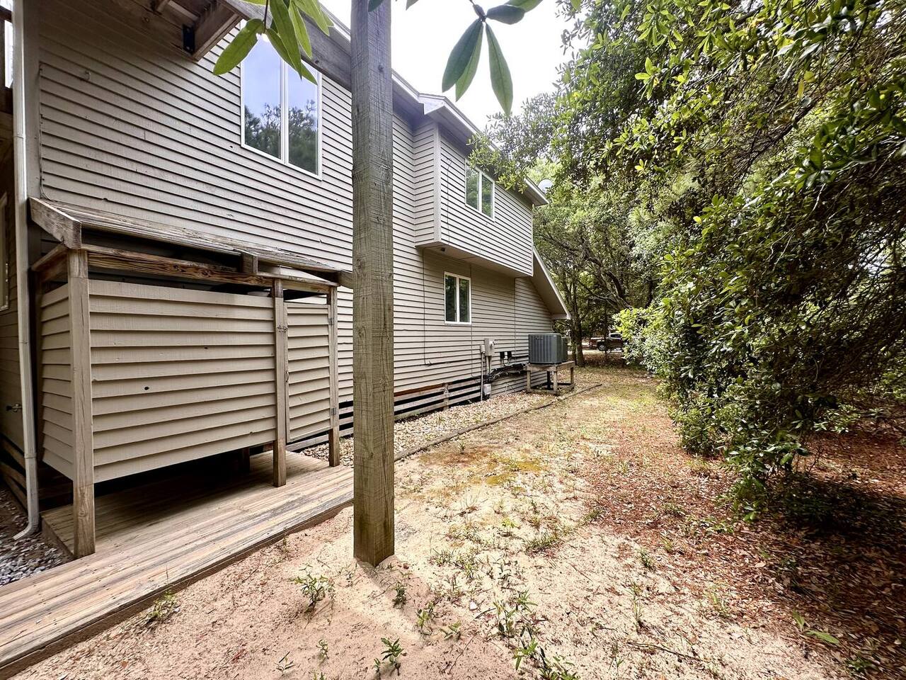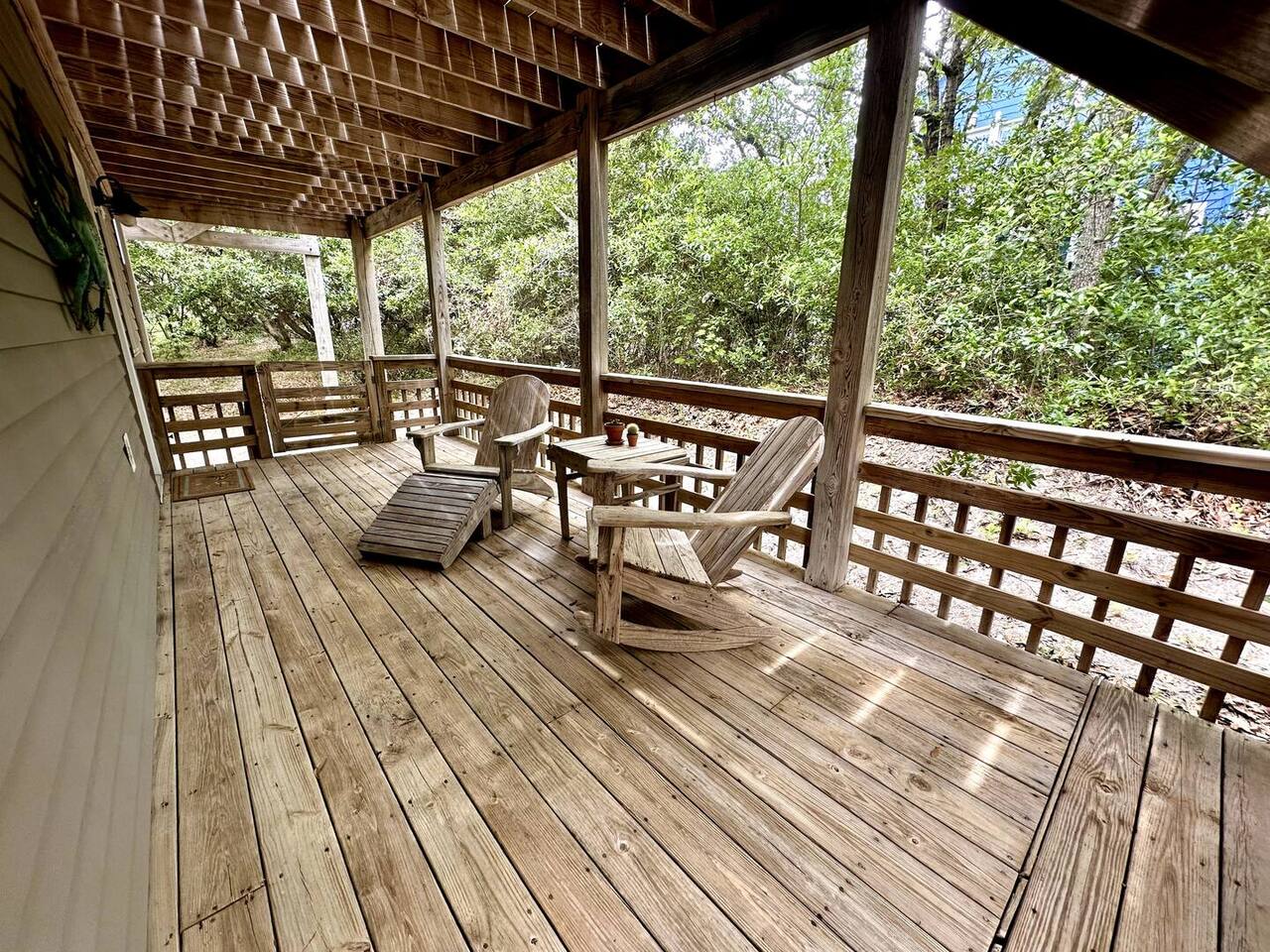 🌊 Toes in the sand in minutes – no driving or parking required 🏡 Never rented before 2024– everything is fresh, modern, and sparkling clean 🛍️ Walk or bike to restaurants, shops, and the iconic Kitty Hawk Pier 🌳 Quiet and private, yet close to everything the Outer Banks has to offer 🚲 Ideal launch point for exploring Duck, Kitty Hawk, Kill Devil Hills & more Walk up a short set of steps to a lower-level deck where the main entrance to home is located. The level you enter on has three bedrooms, one full bathroom, and laundry room with washer and dryer. The bedrooms on this level are two twin beds, one king, one queen. Go up one level to the spacious master bedroom suite located off the kitchen, living room, sunroom and additional half bath all located at this top level. Walk out the slider doors to another deck located on this middle level with a propane grill. Go up one more flight of stairs outside to another small deck perfect for privacy and sunbathing on the sun loungers! Outdoor shower located at ground level. BONUS - TVs located in all bedrooms and tons are outdoor furniture scattered throughout the decking for added areas to retreat to!