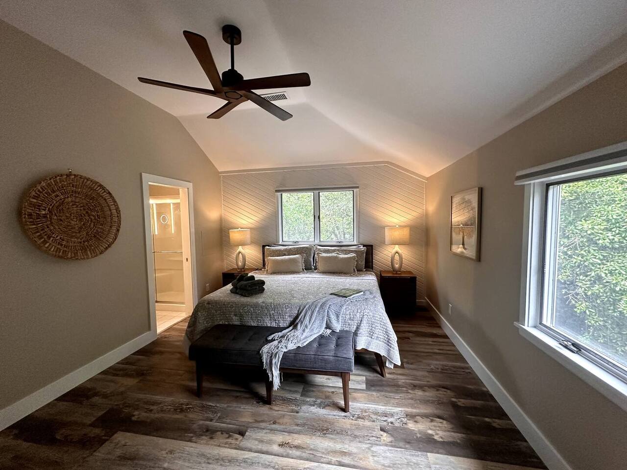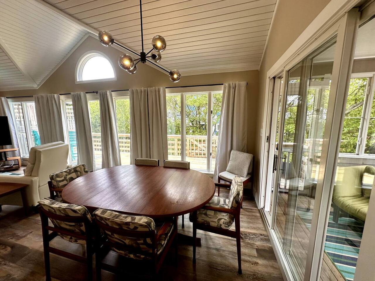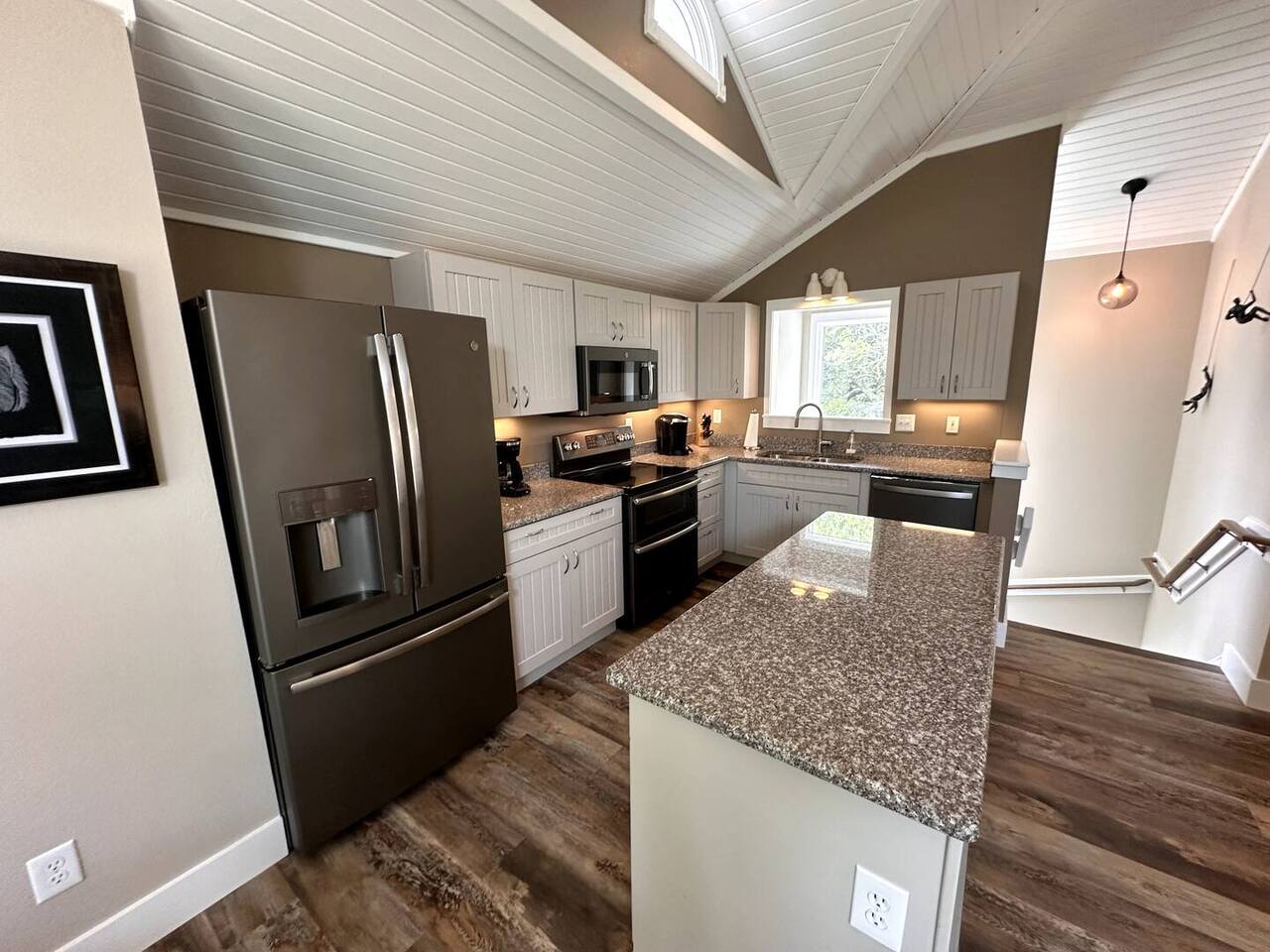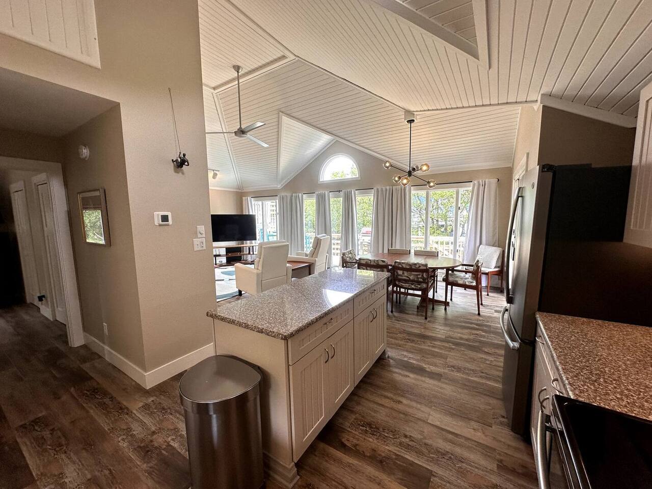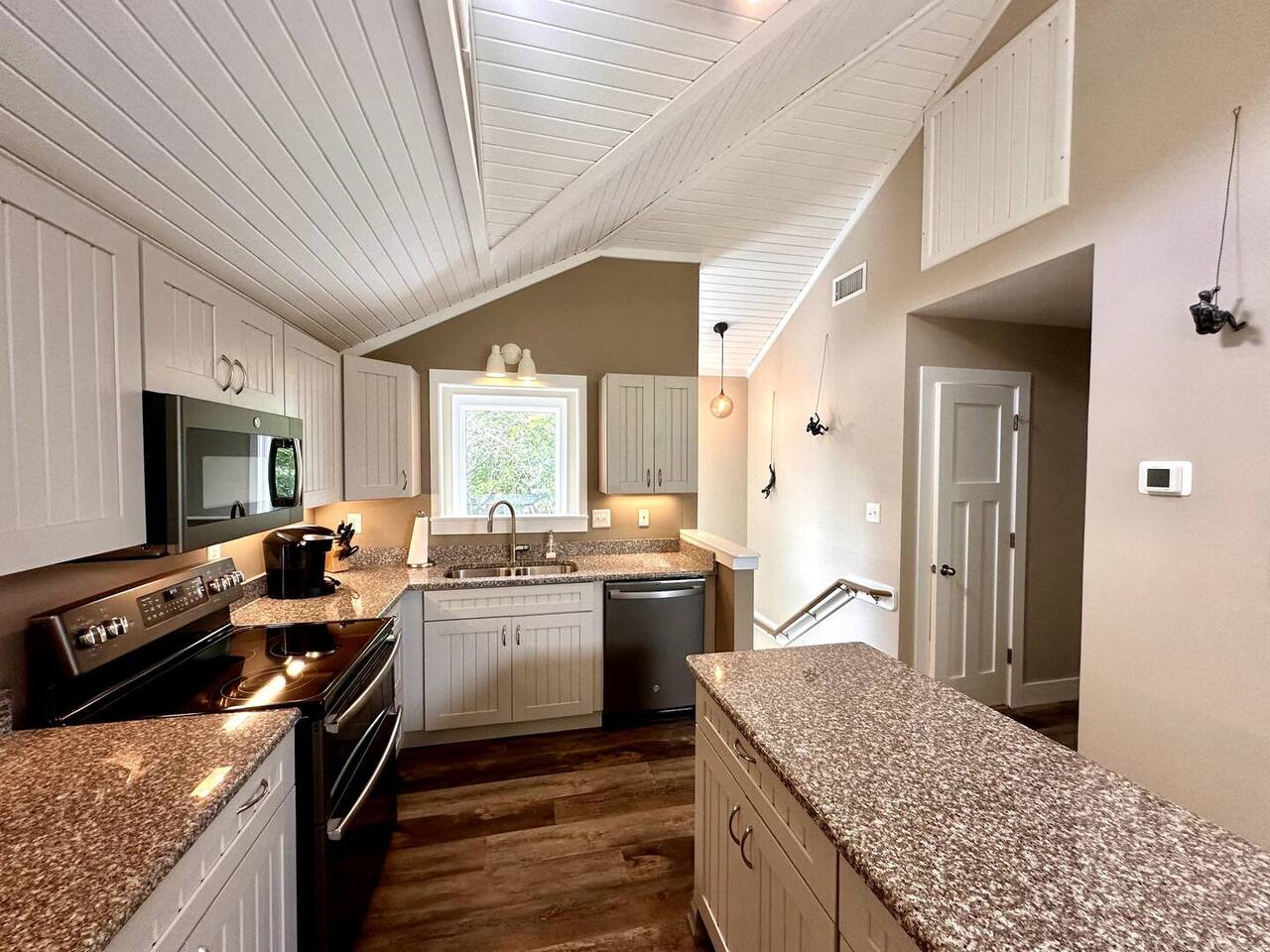 🌊 Toes in the sand in minutes – no driving or parking required 🏡 Never rented before 2024– everything is fresh, modern, and sparkling clean 🛍️ Walk or bike to restaurants, shops, and the iconic Kitty Hawk Pier 🌳 Quiet and private, yet close to everything the Outer Banks has to offer 🚲 Ideal launch point for exploring Duck, Kitty Hawk, Kill Devil Hills & more Walk up a short set of steps to a lower-level deck where the main entrance to home is located. The level you enter on has three bedrooms, one full bathroom, and laundry room with washer and dryer. The bedrooms on this level are two twin beds, one king, one queen. Go up one level to the spacious master bedroom suite located off the kitchen, living room, sunroom and additional half bath all located at this top level. Walk out the slider doors to another deck located on this middle level with a propane grill. Go up one more flight of stairs outside to another small deck perfect for privacy and sunbathing on the sun loungers! Outdoor shower located at ground level. BONUS - TVs located in all bedrooms and tons are outdoor furniture scattered throughout the decking for added areas to retreat to!