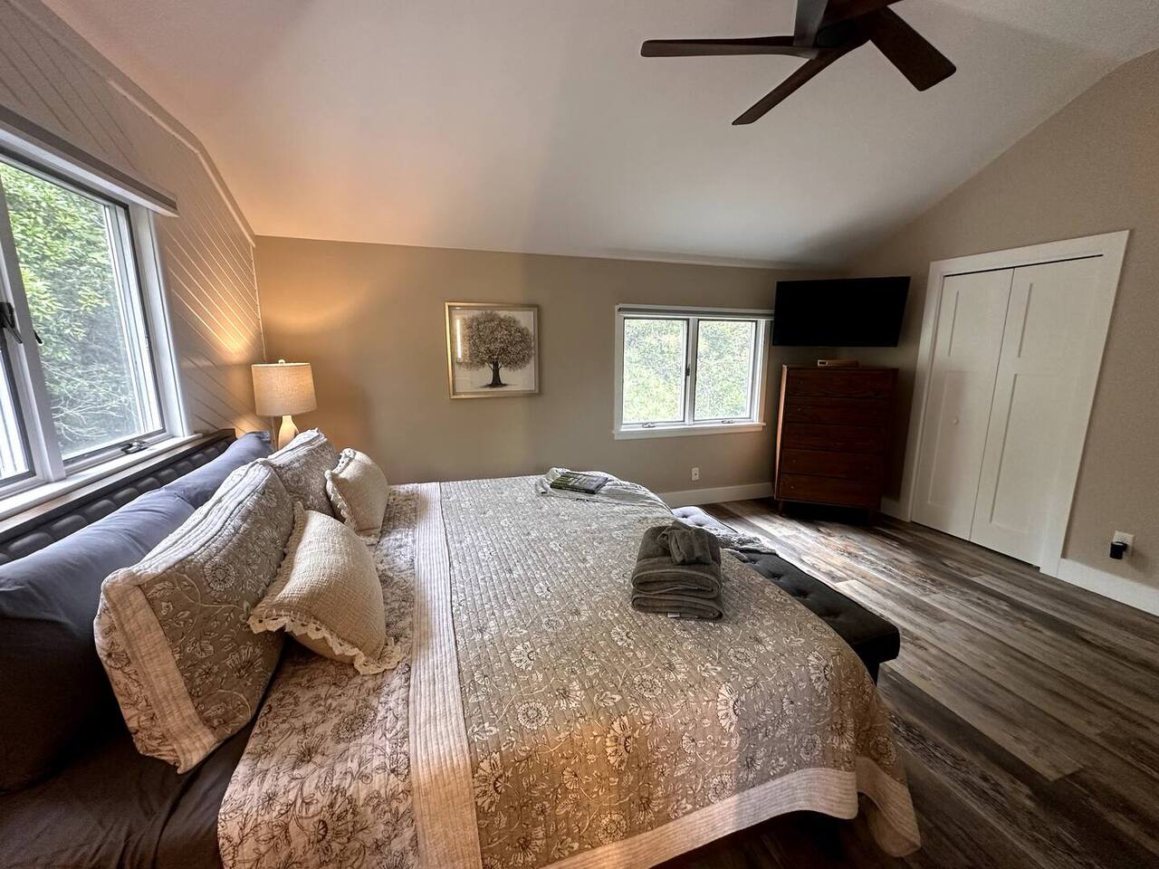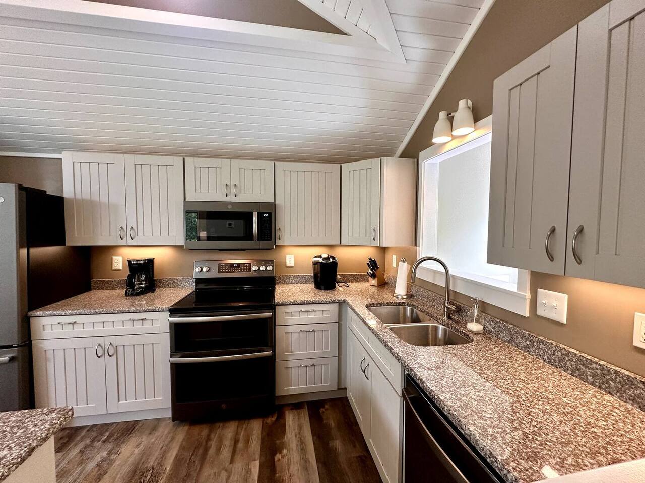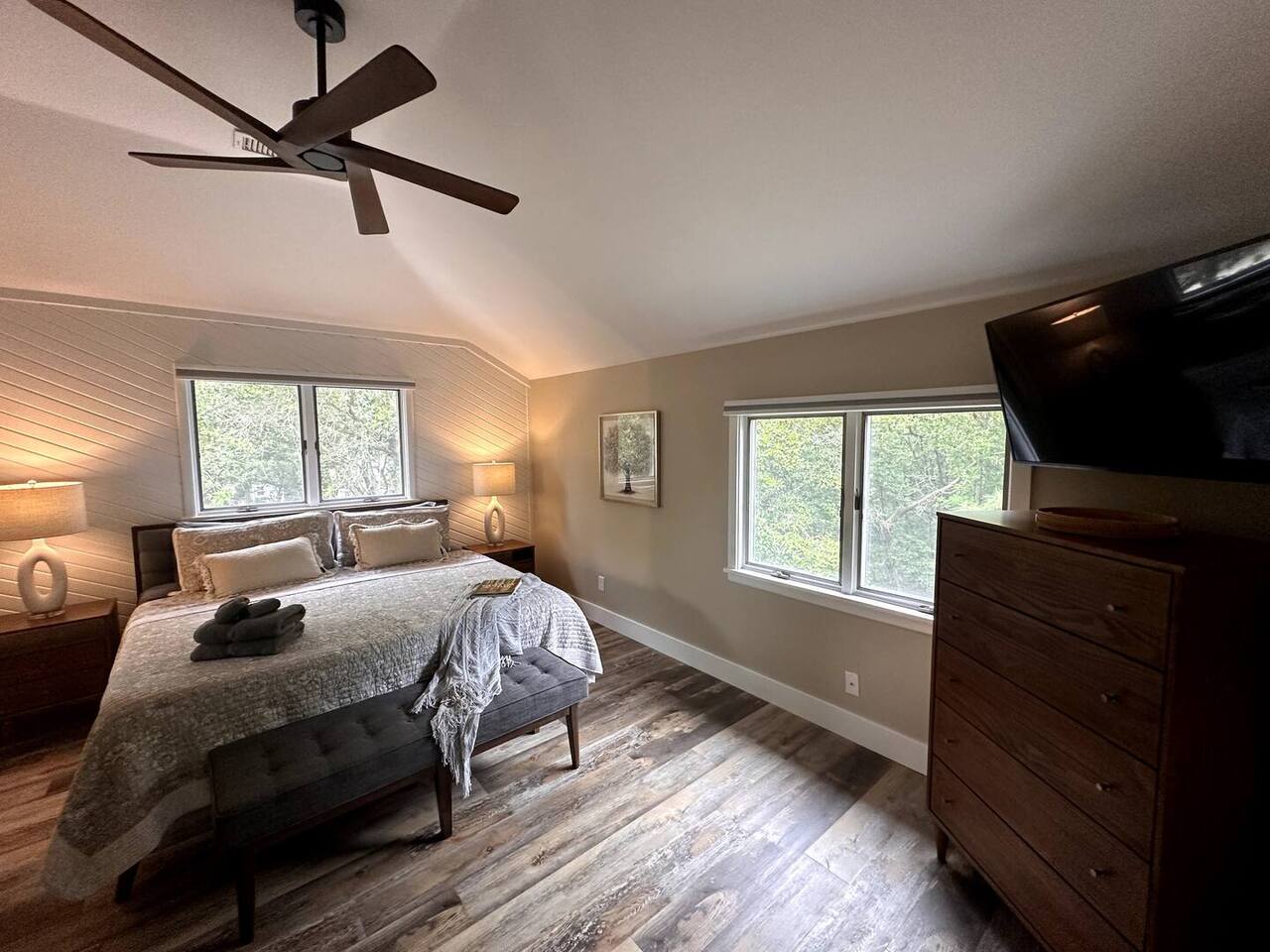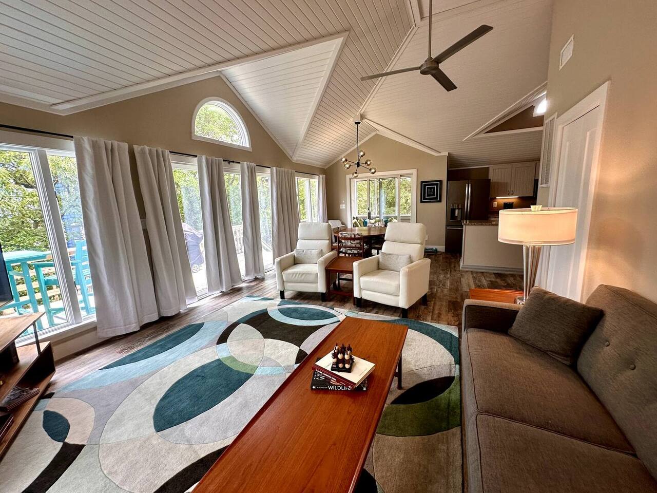 🌊 Toes in the sand in minutes – no driving or parking required 🏡 Never rented before 2024– everything is fresh, modern, and sparkling clean 🛍️ Walk or bike to restaurants, shops, and the iconic Kitty Hawk Pier 🌳 Quiet and private, yet close to everything the Outer Banks has to offer 🚲 Ideal launch point for exploring Duck, Kitty Hawk, Kill Devil Hills & more Walk up a short set of steps to a lower-level deck where the main entrance to home is located. The level you enter on has three bedrooms, one full bathroom, and laundry room with washer and dryer. The bedrooms on this level are two twin beds, one king, one queen. Go up one level to the spacious master bedroom suite located off the kitchen, living room, sunroom and additional half bath all located at this top level. Walk out the slider doors to another deck located on this middle level with a propane grill. Go up one more flight of stairs outside to another small deck perfect for privacy and sunbathing on the sun loungers! Outdoor shower located at ground level. BONUS - TVs located in all bedrooms and tons are outdoor furniture scattered throughout the decking for added areas to retreat to!