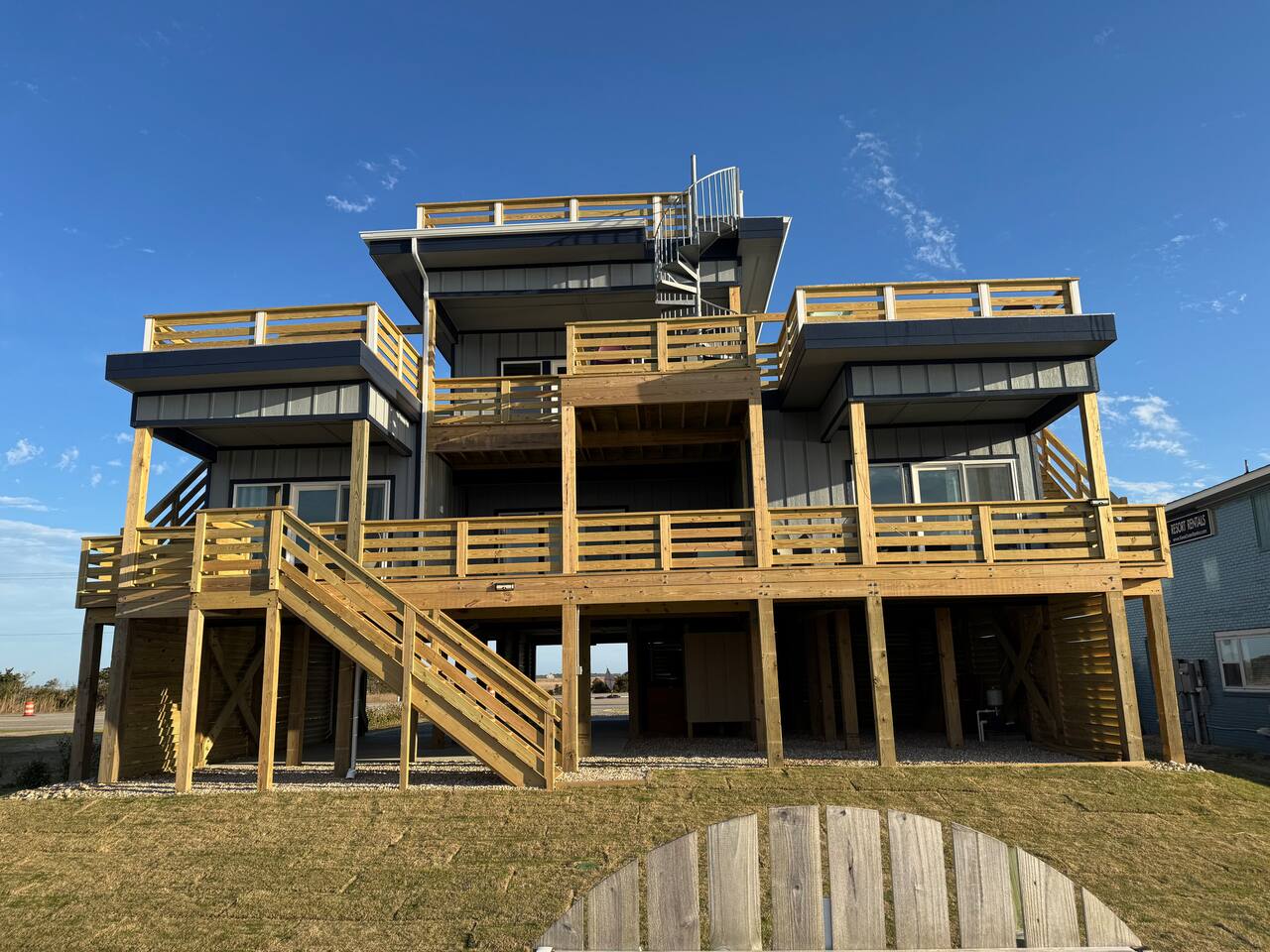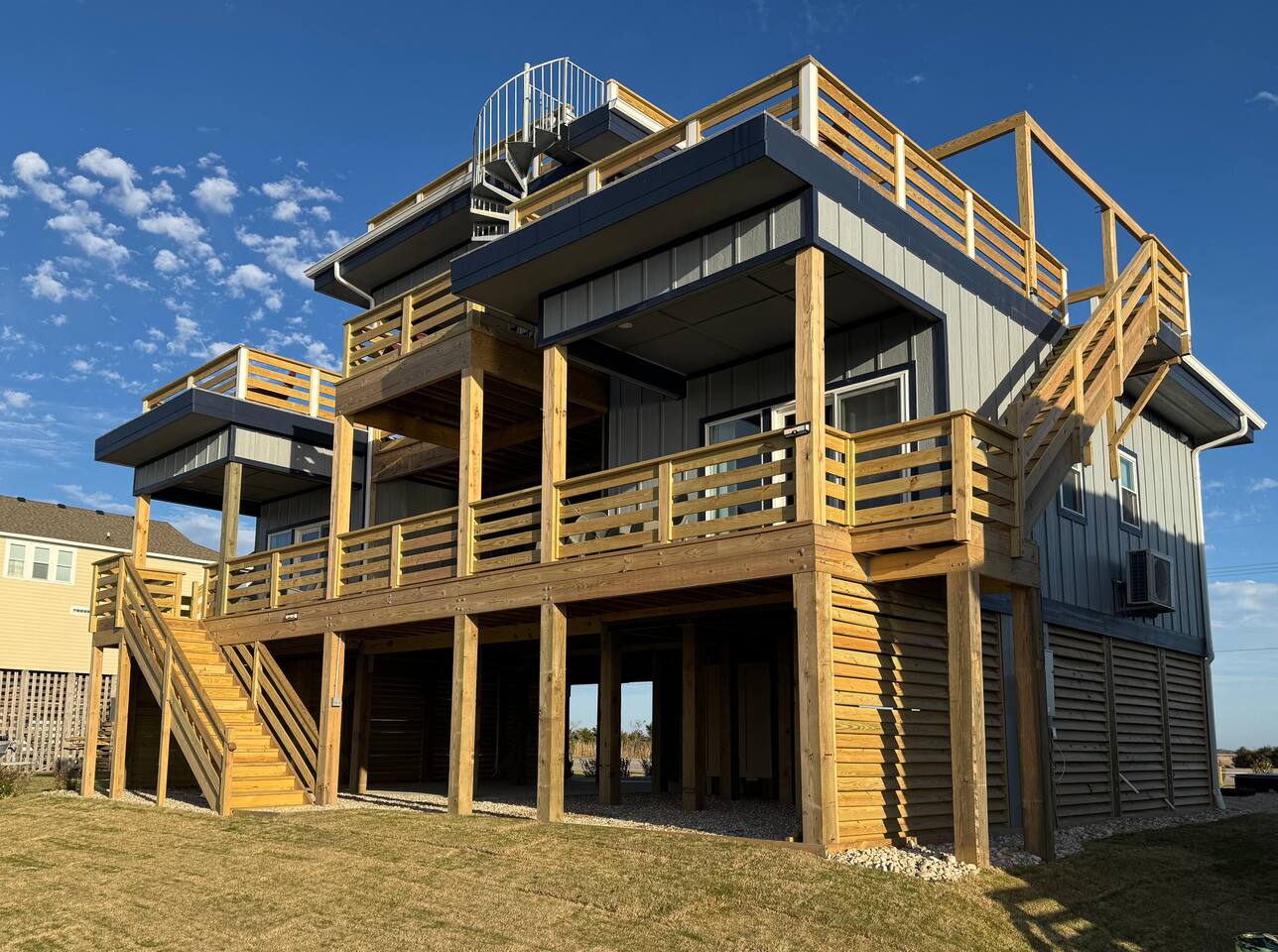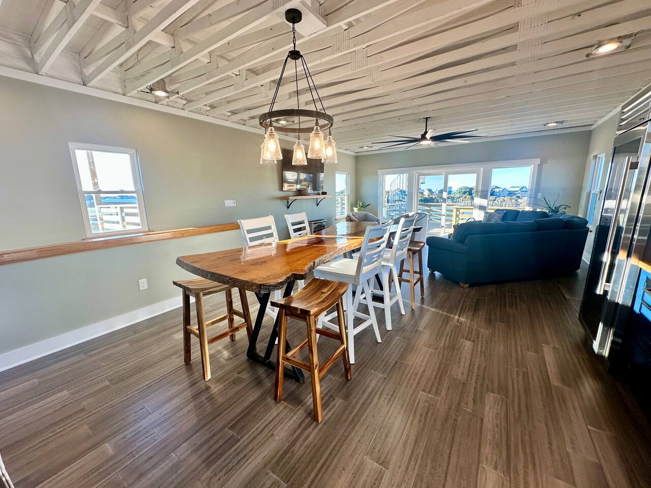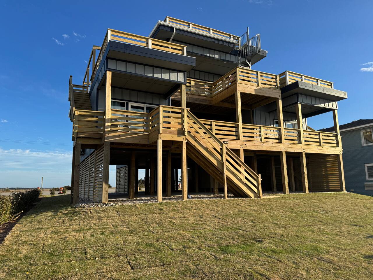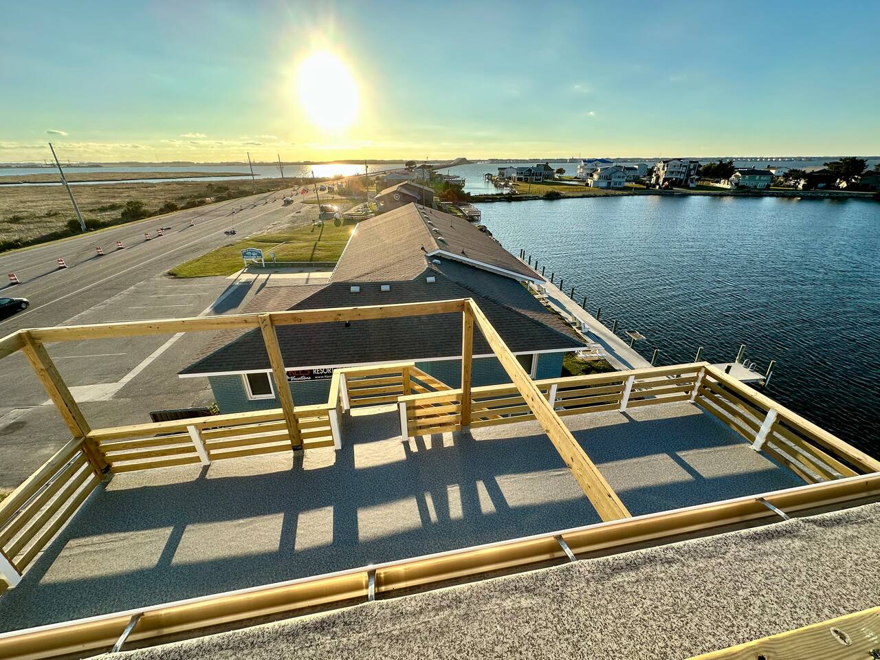 This home adopted a Sea Turtle Hatchling - Travel with Purpose when you stay with us and assist in global efforts to help save this beautiful endangered species! Book your stay now & be among the first to experience this brand-new OBX gem – adventure, serenity, & salty breezes await... 💦 Water, water everywhere! Fish, crab, or launch your kayak right from your private dock 🚤 Quick boat access to some of the best offshore fishing on the East Coast 🏖️ Just 1.6 miles to the beach for sun-soaked days in the sand 🌅 Only 4 miles to historic Downtown Manteo – go by car or boat! 🌉 Located right on the scenic Causeway – centrally placed to explore all of the OBX In the Spirit of Nags Head - As you pull into the driveway there is parking that leads you under the home. There is an outdoor shower located here for your convenience to rinse off outside prior to going in after an enjoyable day at the beach or after a day on your boat! Go up one flight of stairs to the main entrance. This leads you into the level with 4 bedrooms each with their own attached bathroom, king bed and tiled shower! Two of the larger suites have a wet bar as well for your added enjoyment! One of the larger suites has a spacious desk with printer to keep you productive while away! Three of the four bedrooms have slider doors that lead out to the deck facing Pond Island! Washer and dryer located on the bedroom level. Go up one internal flight of stairs to the top-level open concept Living room and eat-in well stocked kitchen with custom made live edge dining table! Large couch and two swivel chairs to accommodate eight in the living room with large flat screen TV above the gas fireplace. Open shelving kitchen with stainless appliances with a bonus second fridge to house your drinks or catered items! Coffee bar and Half bath also located on this level! Panoramic water views from every angle and therefore no window treatments needed at top level! Slider door from the living room takes you to another level of decking along with a spiral staircase to take you to the very top deck for more unobstructed views - the Town of Manteo, Jockeys Ridge, Jeanette’s Pier, the Bodie Lighthouse, watch the fishermen drive back to their slip in the distance as they head towards the Marc Basnight bridge, the views are endless! Inside of house is just under 2000 square feet; however, enjoy 3000 square feet of rooftop and deck!