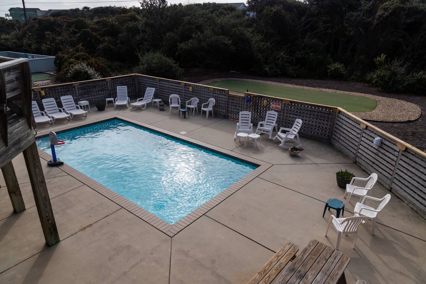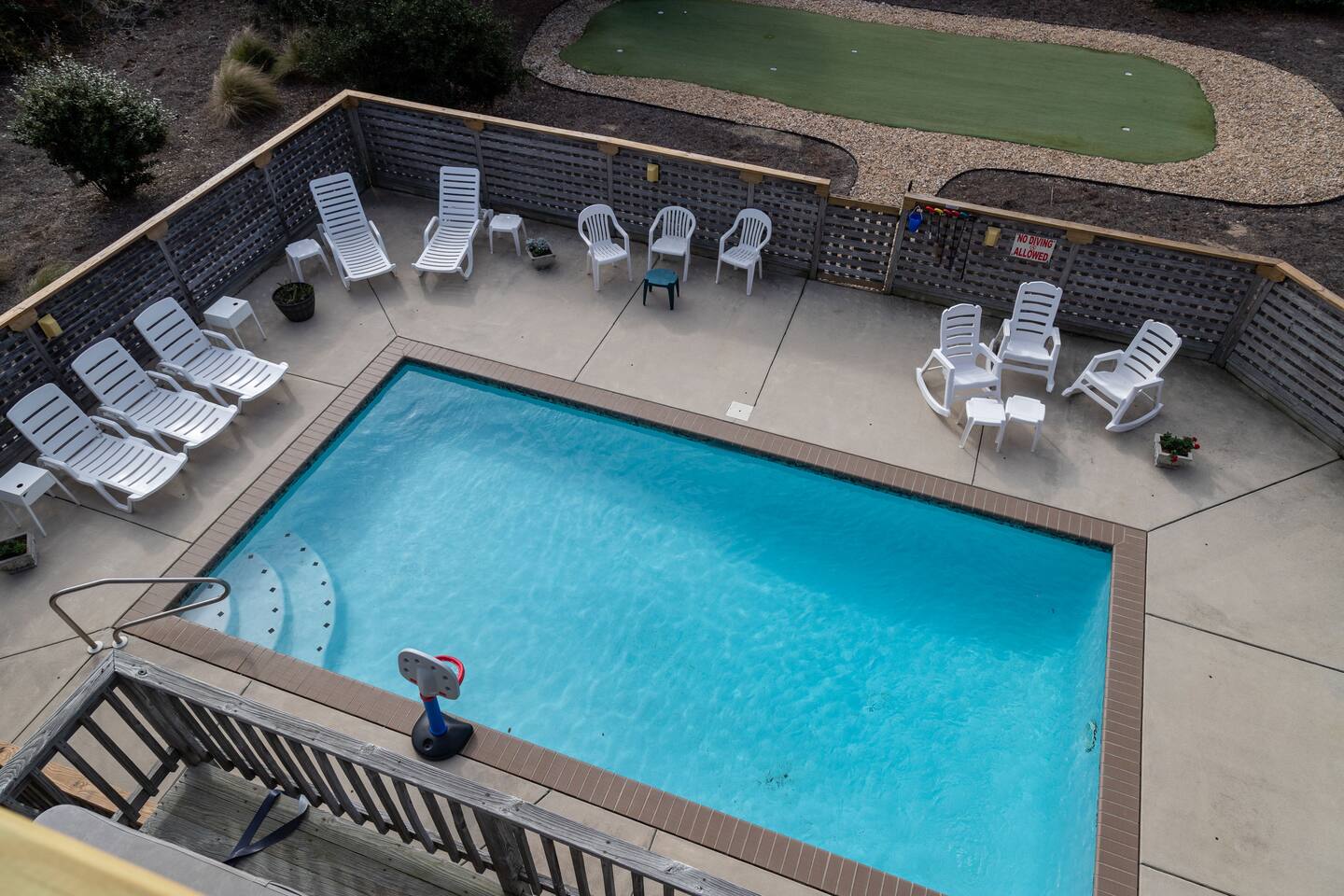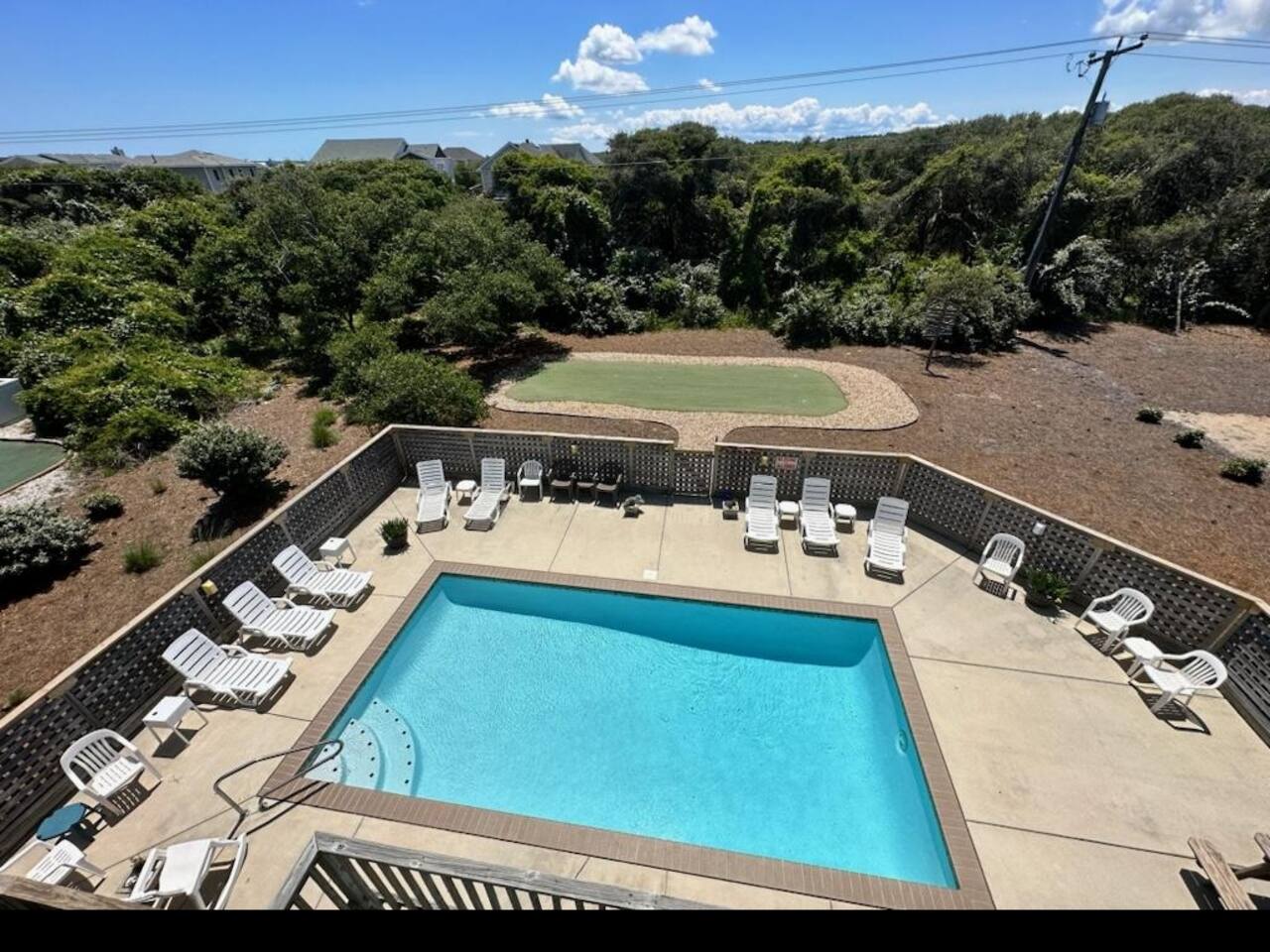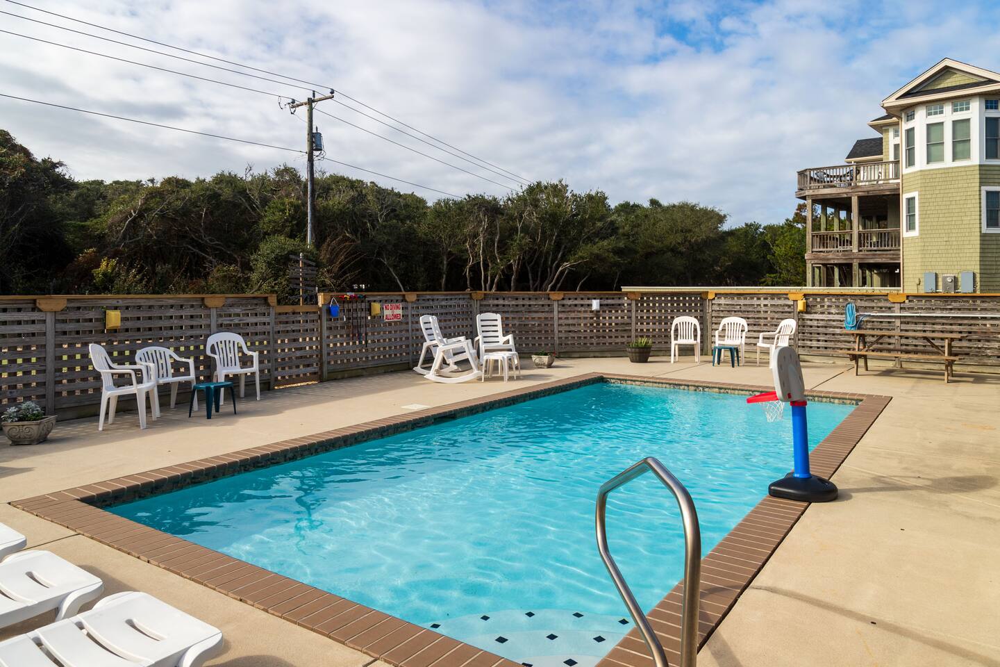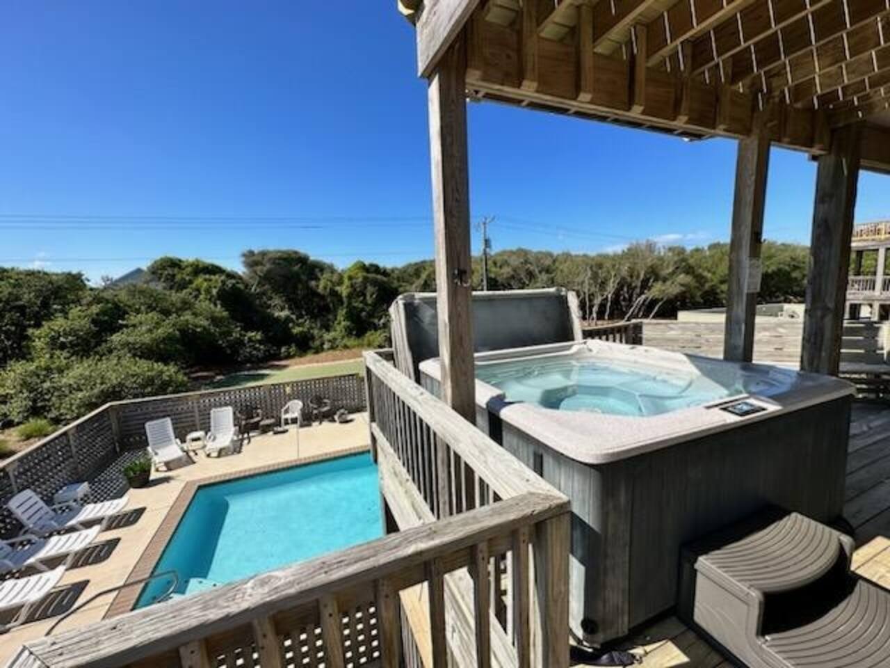 Book now and get ready to sink your toes in the sand – your Duck vacation awaits... 🌊 Just 600 feet to the beach – no major roads to cross! 🏖️ Private pool & hot tub – your own backyard oasis 🔥 Poolside grill & fireplace – made for cookouts and cozy nights 🎯 Putting green – fun for kids and adults alike 🍳 Well-stocked kitchen – perfect for group meals 🎾 Access to Ocean Crest community pool & tennis court 🚶♀️ Only 1.3 miles to Duck Village – stroll to shopping, dining & more 🛏️ Comfortably sleeps up to 15 guests – ideal for large families or groups On arrival you will notice the spacious driveway to make parking easy for you and your group! Basketball hoop located on side of driveway! At ground level outside is a poolside half bath, outdoor shower, and foot rinse for easy access when coming back from beach and while enjoying the pool! Enter home at ground level - living room located on this level with smart TV and wet bar, foosball, one bedroom with two bunk beds & smart TV, one full bathroom, full-size secondary fridge/freezer, laundry room, and slider door leading out to private gated pool, putting green, and propane grill. Go up one level for access to den with card table for 4, smart TV, exterior door leading to second level deck and hot tub. The den/third living room is the perfect card table or place to retreat to work or study. The bedroom with two single beds is also located on this level with smart TV. Those that occupy the two single beds can occupy the hall full bath. Three more bedrooms (king and 2 queen beds) with attached full bathrooms (on-suites), smart TV's in all bedrooms, and access to second level deck from each of these three bedrooms. Go to top level for access to main living room with large smart TV, gas fireplace, dining areas including high top tables with views of the Ocean, well outfitted kitchen, additional deck access off living room, hall half bath, and king bedroom ensuite with shower, jacuzzi tub, dual vanity, and deck access. The home is very spacious with many areas to retreat to! The table in the den or the high-top tables off the kitchen/dining/living area could double an as area to set up your laptop and take care of business while on your getaway!
