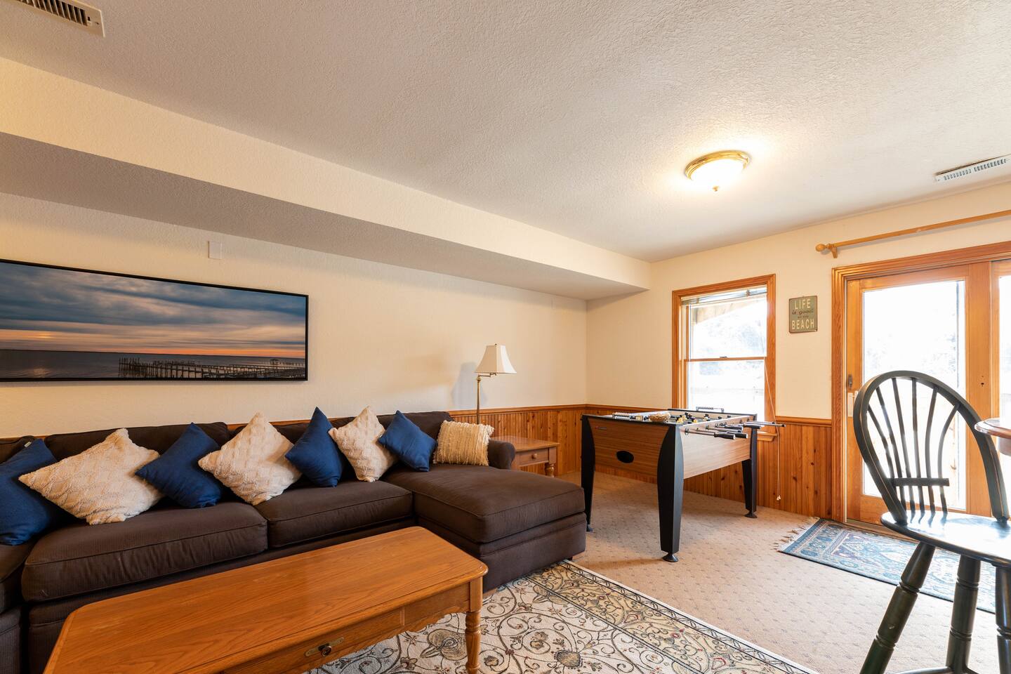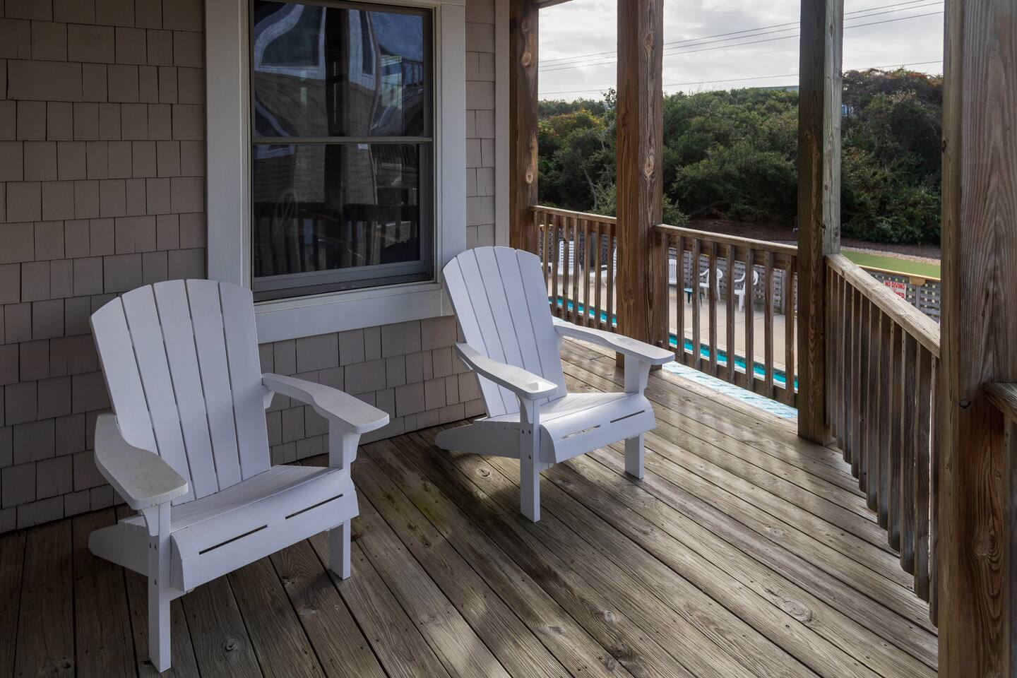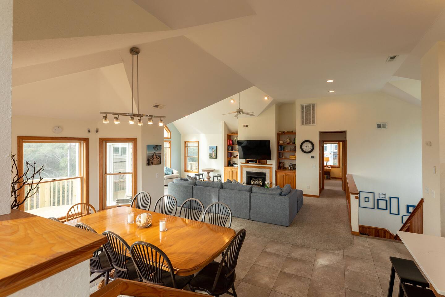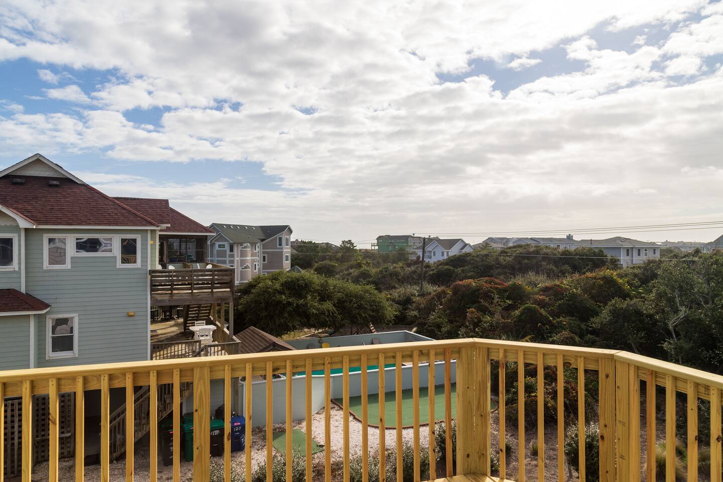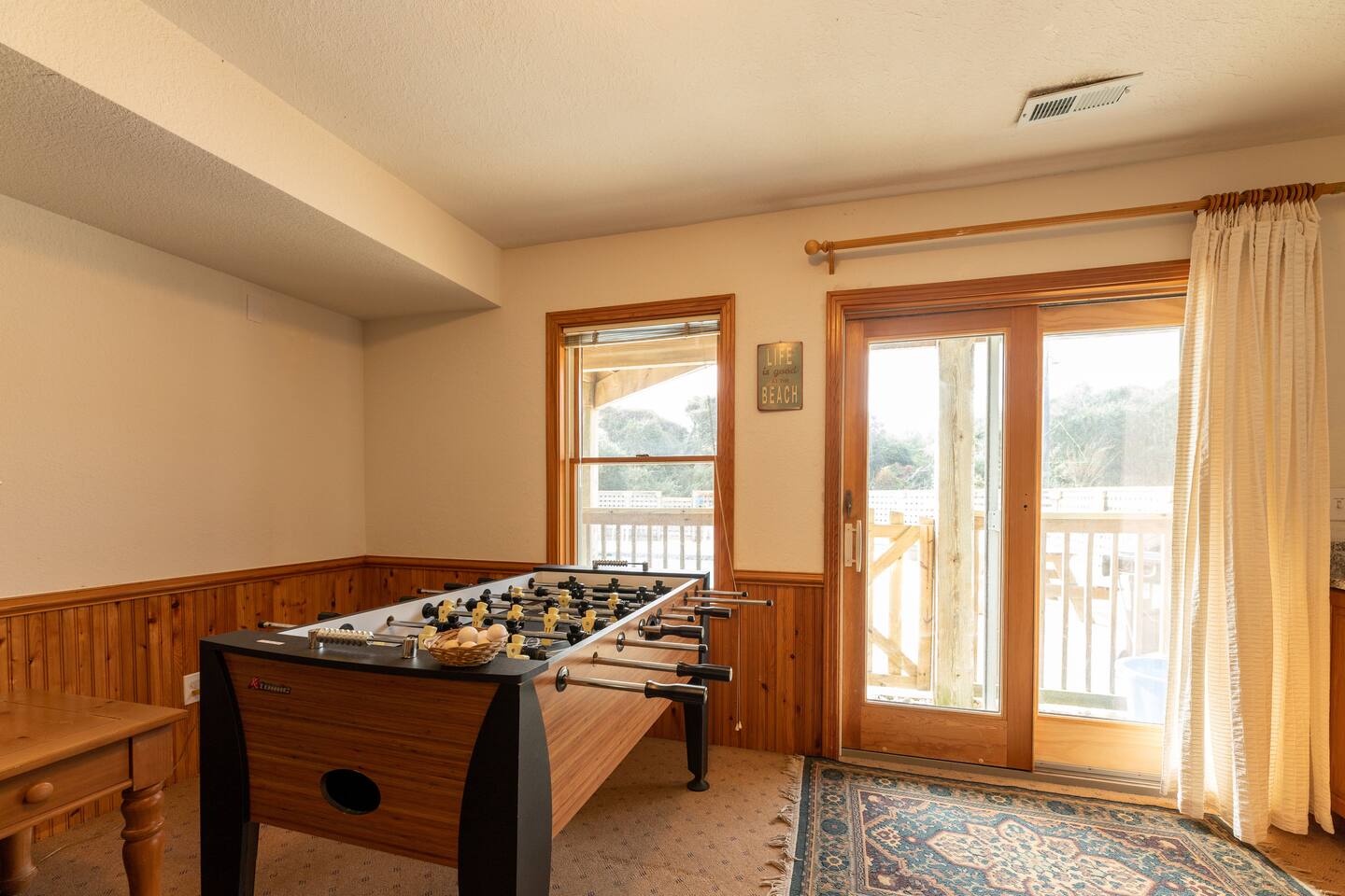 Book now and get ready to sink your toes in the sand – your Duck vacation awaits... 🌊 Just 600 feet to the beach – no major roads to cross! 🏖️ Private pool & hot tub – your own backyard oasis 🔥 Poolside grill & fireplace – made for cookouts and cozy nights 🎯 Putting green – fun for kids and adults alike 🍳 Well-stocked kitchen – perfect for group meals 🎾 Access to Ocean Crest community pool & tennis court 🚶♀️ Only 1.3 miles to Duck Village – stroll to shopping, dining & more 🛏️ Comfortably sleeps up to 15 guests – ideal for large families or groups On arrival you will notice the spacious driveway to make parking easy for you and your group! Basketball hoop located on side of driveway! At ground level outside is a poolside half bath, outdoor shower, and foot rinse for easy access when coming back from beach and while enjoying the pool! Enter home at ground level - living room located on this level with smart TV and wet bar, foosball, one bedroom with two bunk beds & smart TV, one full bathroom, full-size secondary fridge/freezer, laundry room, and slider door leading out to private gated pool, putting green, and propane grill. Go up one level for access to den with card table for 4, smart TV, exterior door leading to second level deck and hot tub. The den/third living room is the perfect card table or place to retreat to work or study. The bedroom with two single beds is also located on this level with smart TV. Those that occupy the two single beds can occupy the hall full bath. Three more bedrooms (king and 2 queen beds) with attached full bathrooms (on-suites), smart TV's in all bedrooms, and access to second level deck from each of these three bedrooms. Go to top level for access to main living room with large smart TV, gas fireplace, dining areas including high top tables with views of the Ocean, well outfitted kitchen, additional deck access off living room, hall half bath, and king bedroom ensuite with shower, jacuzzi tub, dual vanity, and deck access. The home is very spacious with many areas to retreat to! The table in the den or the high-top tables off the kitchen/dining/living area could double an as area to set up your laptop and take care of business while on your getaway!