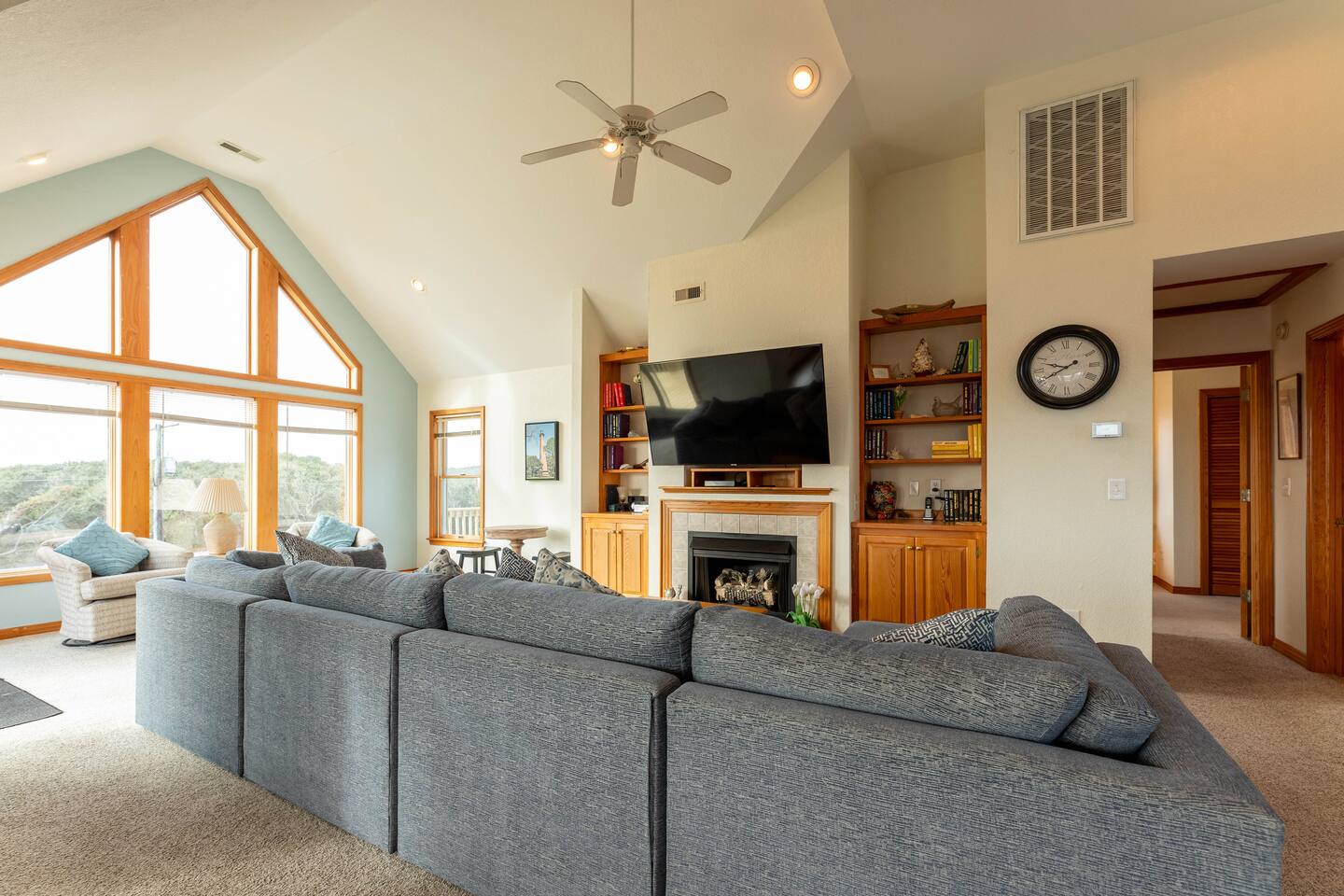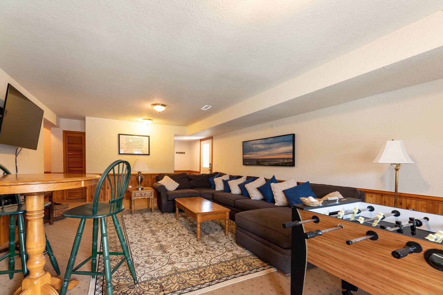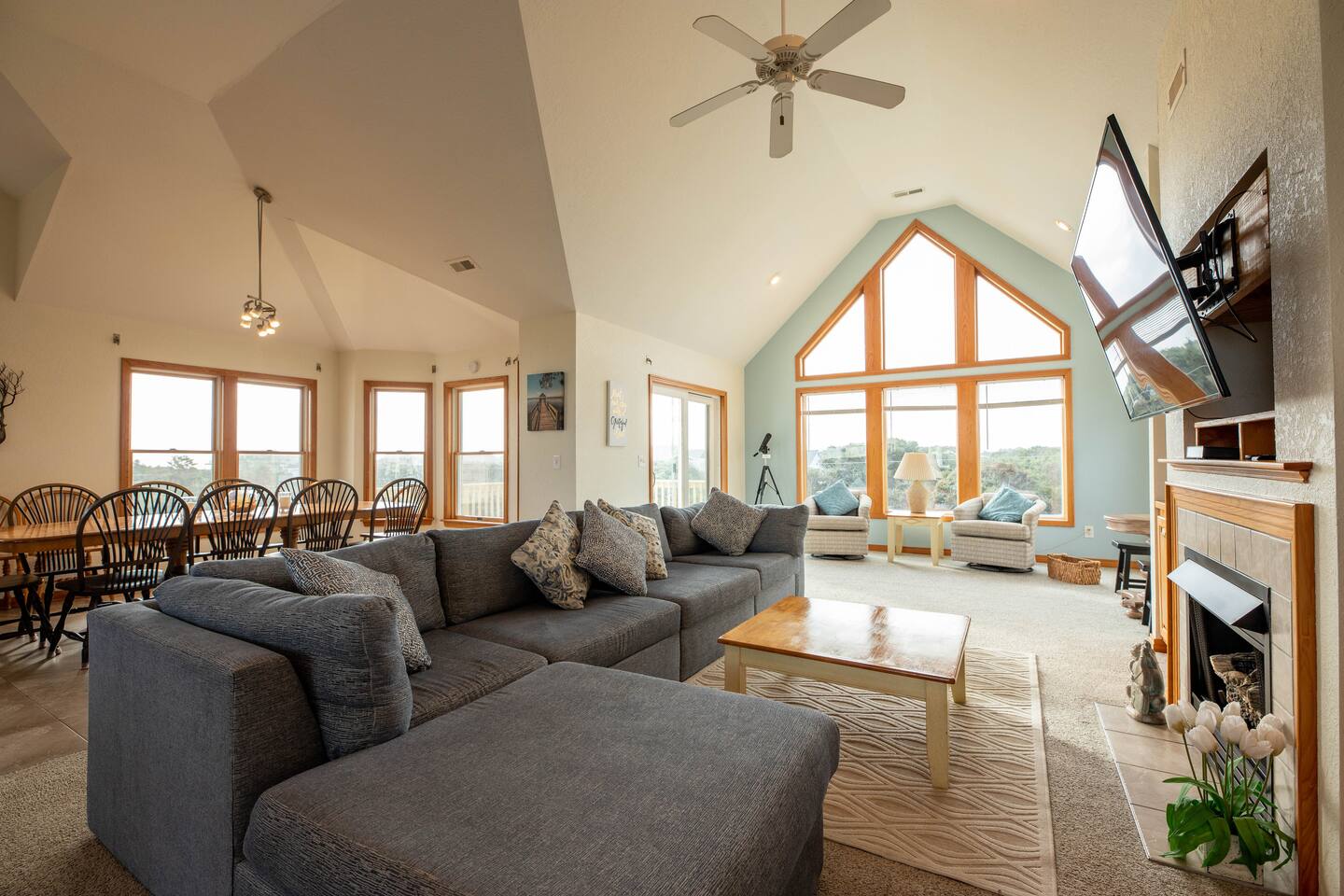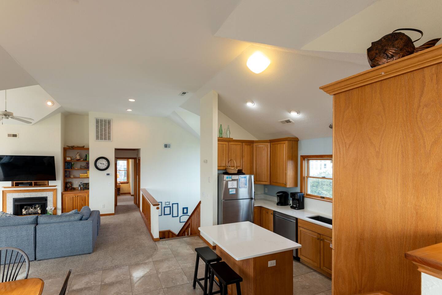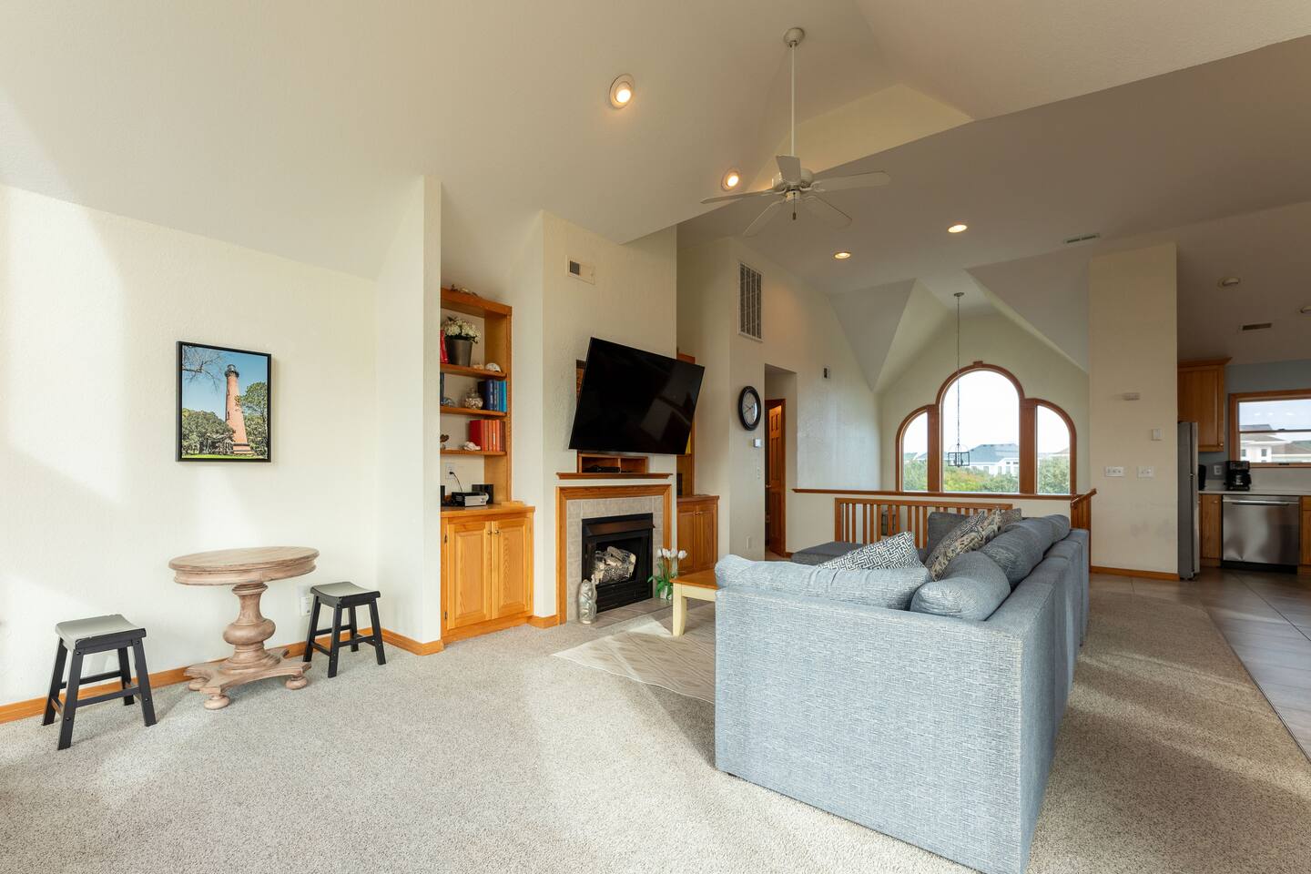 Book now and get ready to sink your toes in the sand – your Duck vacation awaits... 🌊 Just 600 feet to the beach – no major roads to cross! 🏖️ Private pool & hot tub – your own backyard oasis 🔥 Poolside grill & fireplace – made for cookouts and cozy nights 🎯 Putting green – fun for kids and adults alike 🍳 Well-stocked kitchen – perfect for group meals 🎾 Access to Ocean Crest community pool & tennis court 🚶♀️ Only 1.3 miles to Duck Village – stroll to shopping, dining & more 🛏️ Comfortably sleeps up to 15 guests – ideal for large families or groups On arrival you will notice the spacious driveway to make parking easy for you and your group! Basketball hoop located on side of driveway! At ground level outside is a poolside half bath, outdoor shower, and foot rinse for easy access when coming back from beach and while enjoying the pool! Enter home at ground level - living room located on this level with smart TV and wet bar, foosball, one bedroom with two bunk beds & smart TV, one full bathroom, full-size secondary fridge/freezer, laundry room, and slider door leading out to private gated pool, putting green, and propane grill. Go up one level for access to den with card table for 4, smart TV, exterior door leading to second level deck and hot tub. The den/third living room is the perfect card table or place to retreat to work or study. The bedroom with two single beds is also located on this level with smart TV. Those that occupy the two single beds can occupy the hall full bath. Three more bedrooms (king and 2 queen beds) with attached full bathrooms (on-suites), smart TV's in all bedrooms, and access to second level deck from each of these three bedrooms. Go to top level for access to main living room with large smart TV, gas fireplace, dining areas including high top tables with views of the Ocean, well outfitted kitchen, additional deck access off living room, hall half bath, and king bedroom ensuite with shower, jacuzzi tub, dual vanity, and deck access. The home is very spacious with many areas to retreat to! The table in the den or the high-top tables off the kitchen/dining/living area could double an as area to set up your laptop and take care of business while on your getaway!